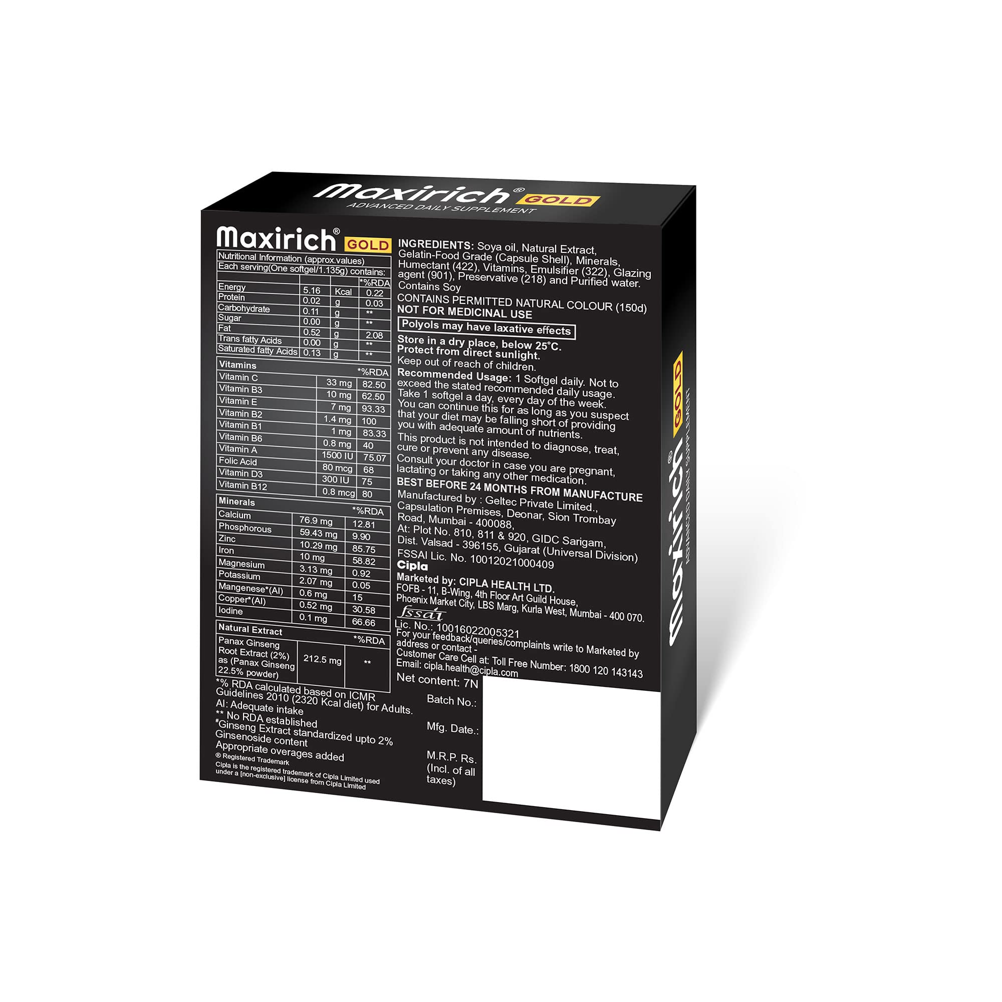 Summi 25/04/2024 Advantages Feel fully energetic and fatigue free after taking MaxiRich Gold Capsules.Health is greater than wealth. Worth the money ?? more Comment Best Multivitamin and multi mineral capsule available in India more