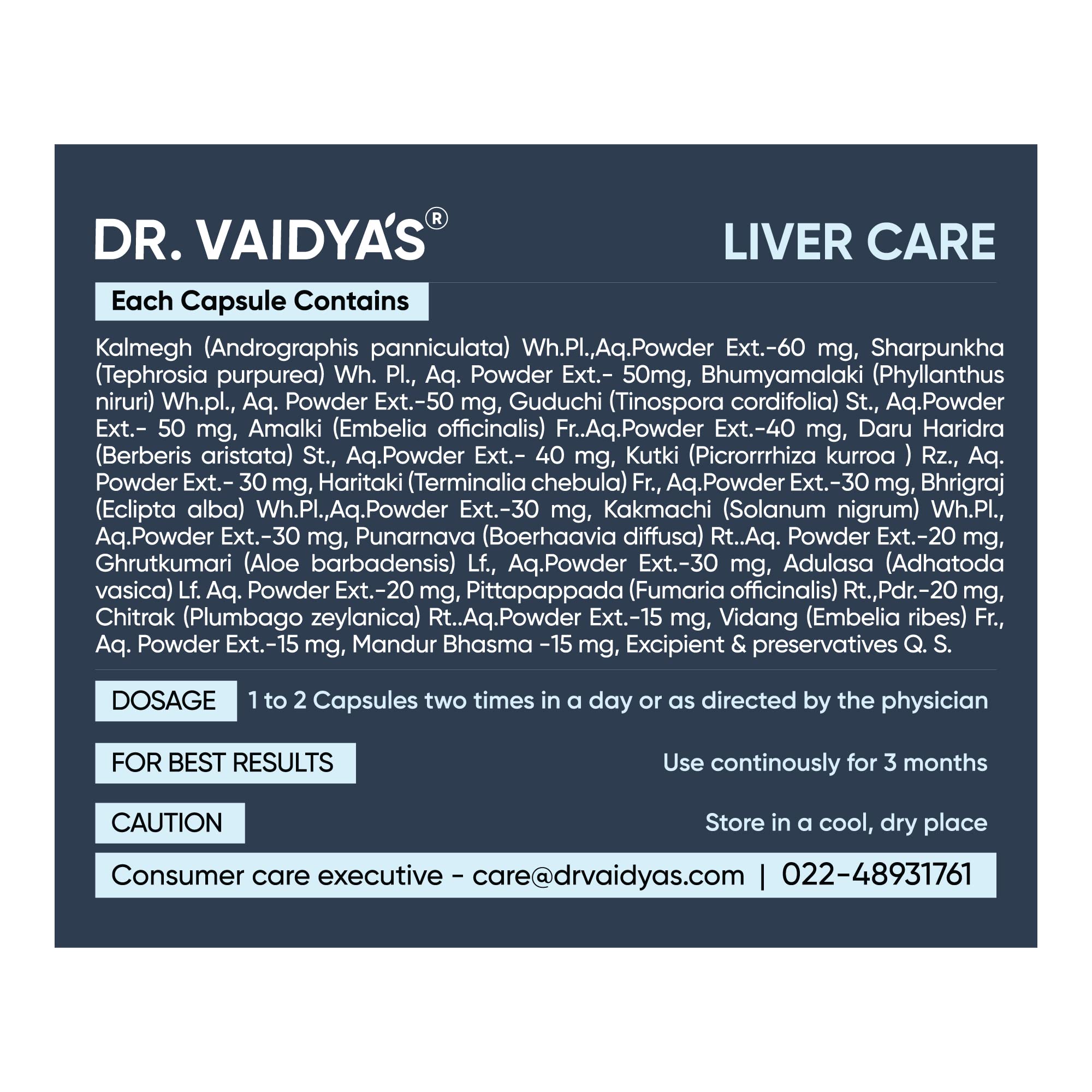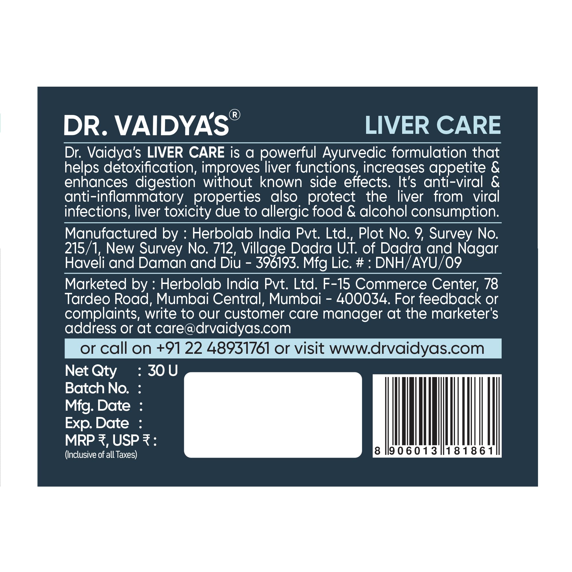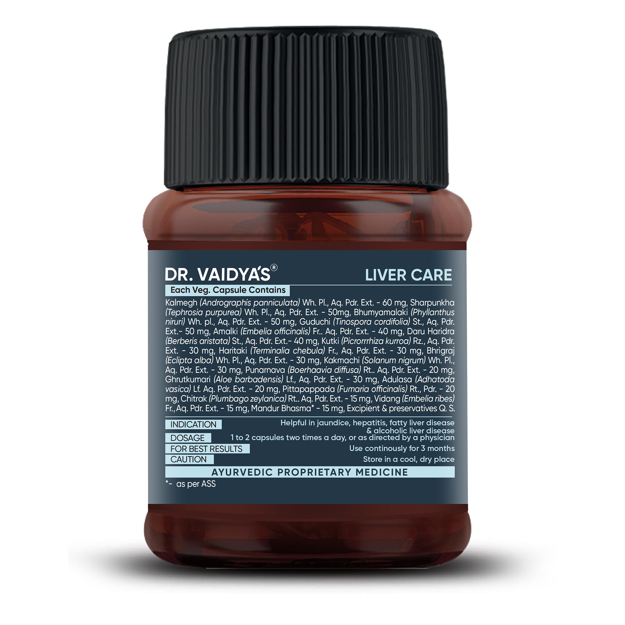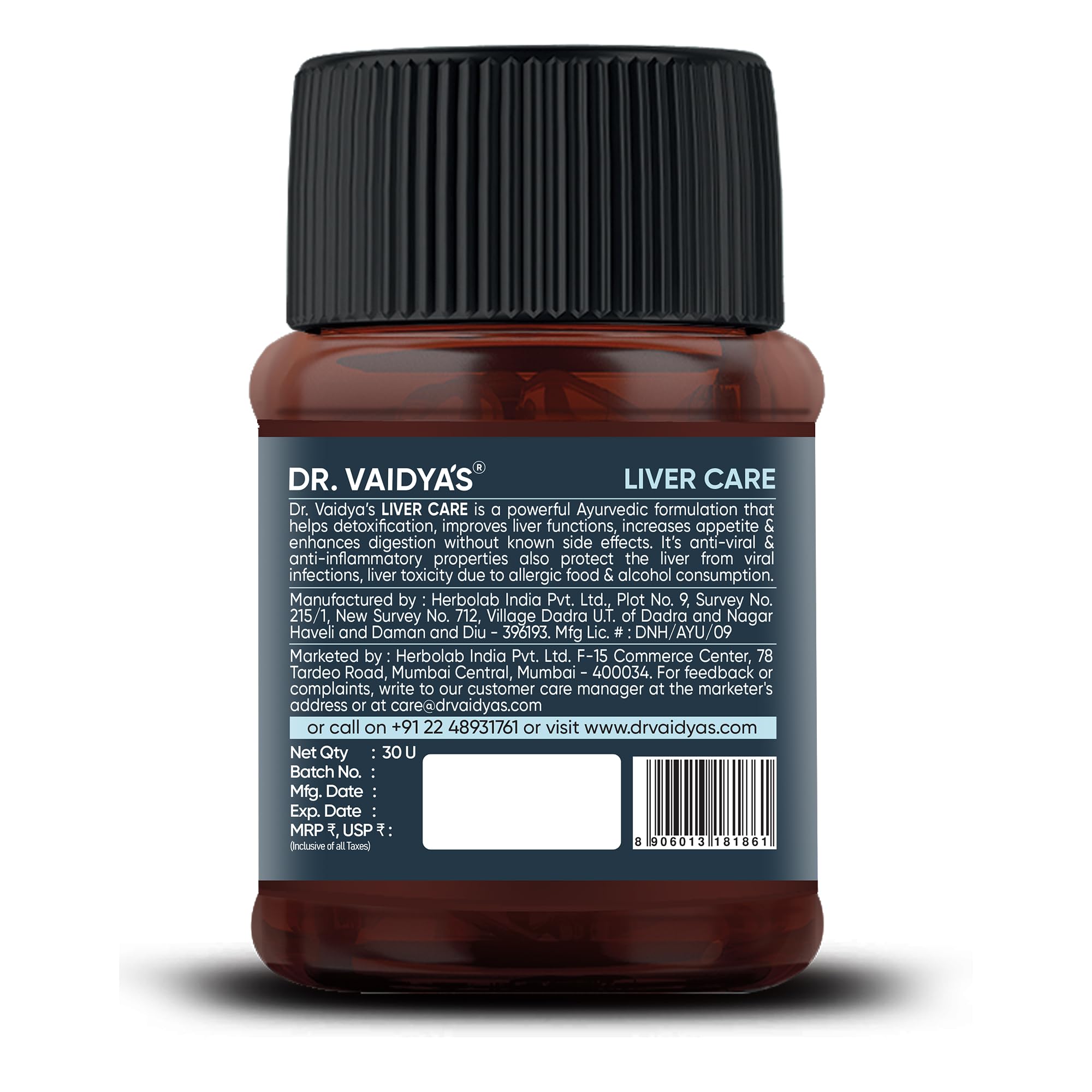 Dr. Vaidya's Liver Care Capsules | Helps With Liver Detox | Natural Ingredients Bhringraj Wheatgrass Juice & Ginseng | FDA Approved | 30 Capsules (Pack of 1)
