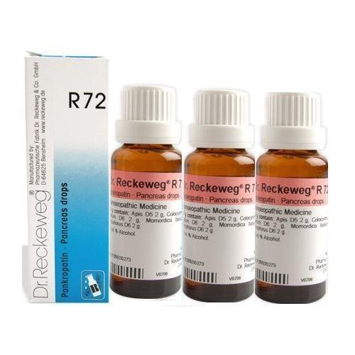 Pancreatitis diseases of the pancreas. Mode of action: The clinical features of chronic pancreatitis are usually ill-defined but include relapsing upper abdominal pain. The pain radiates to the back and is relieved by crouching forward or by lying prone. The pain also increases usually 2-3 hours after meals. Early stage symptoms comprise of intolerance to sweet foods. In case of severe damage to the pancreas steatorrhoea undigested food in stool and large stools are commonly found. The differential diagnosis of stomach intestinal hepatic or gallbladder involvement must be made since the above mentioned symptoms can mimick any of those illnesses. Left hypo gastric pain is typical of chronic pancreatitis. Violent upper abdominal pain however is a constant feature of acute pancreatits. Hospitalization is necessary. The ingredients contained in R 72 cover the symptoms associated with chronic pancreatits: Apis: stitching pain oedema. Colocynthis: Spasmodic pain of the abdomen relieved by bending double. Lycopodium: pain from bloated abdomen in left hypogastric region. Momordica bals: Increased flatulence in the splenic flexue. Phosphorus: Gastric symptoms oily stools fatty degeneration in advanced cases.