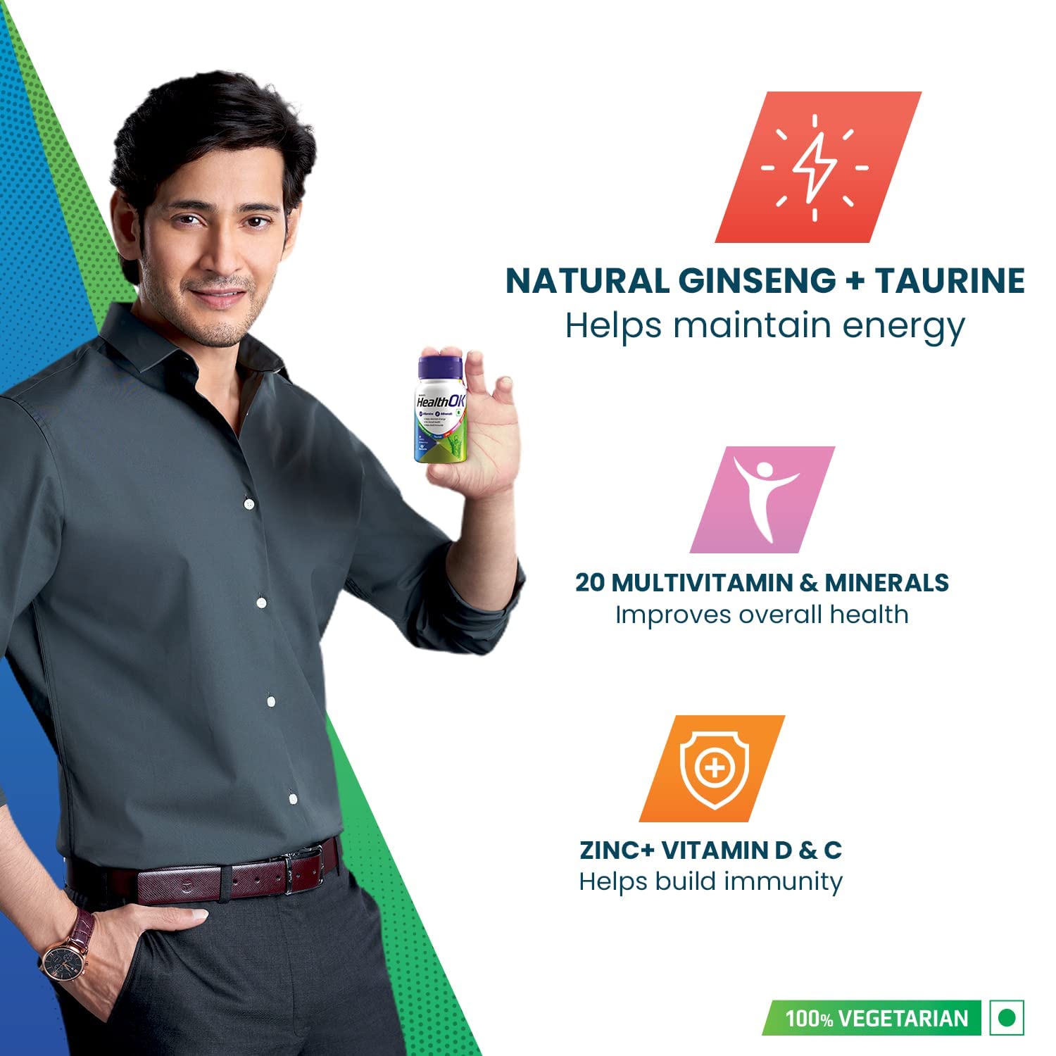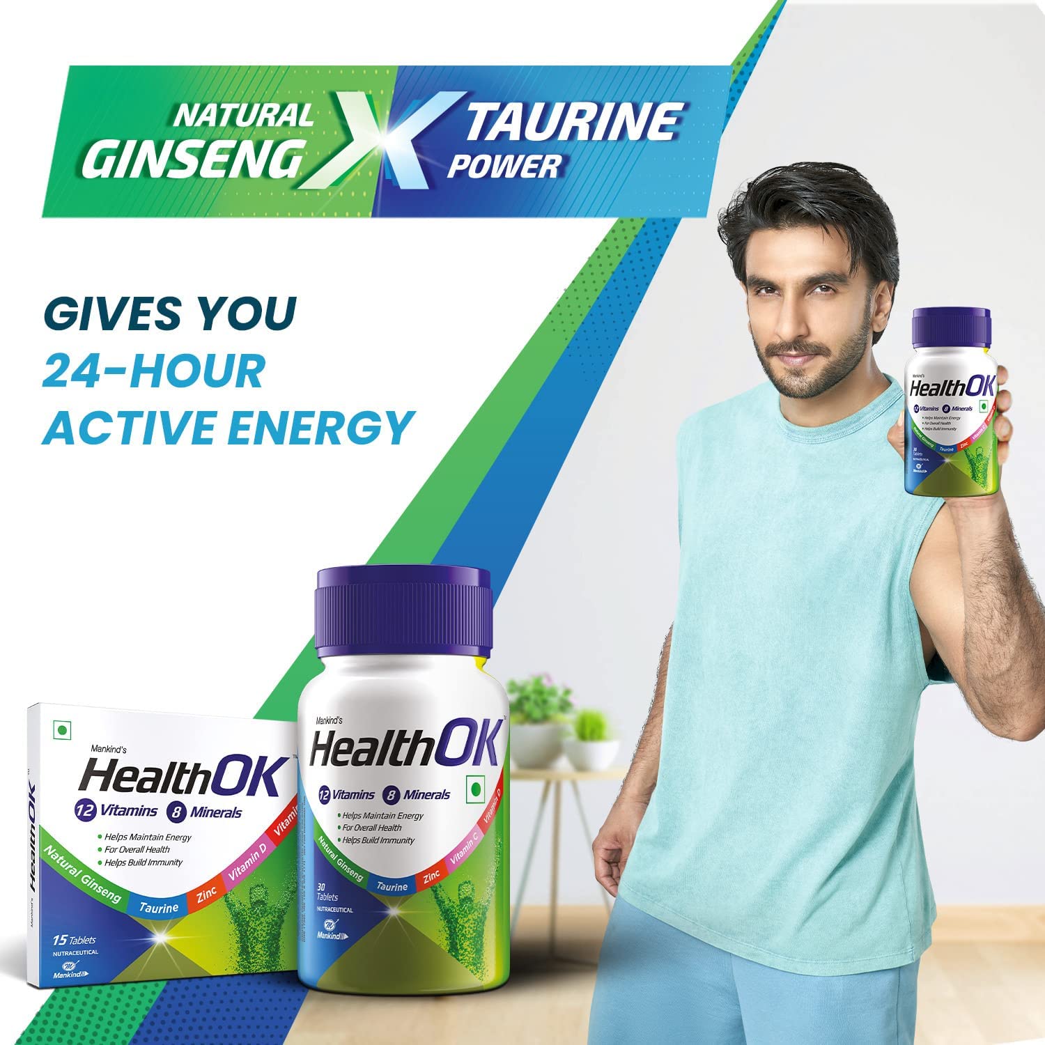 A Hectic routine fast-paced lifestyle and age are some of the major factors that soak up your vigour and leave you all drained. To overcome this you need a supplement that can bring you back to your old energetic self and help you stay the same all around the year. Itâs time you take Health Ok an effective supplement by Mankind comprising of 20 essential multivitamins minerals & amino acids that a body needs to stay in good health. Health Ok formulation contains Natural Ginseng Taurine Zinc and Vitamin C & D all of which are critical to staying energetic and healthy. So take it daily and experience 365 days of improved energy immunity and overall health. Dosage: Take one tablet a day.