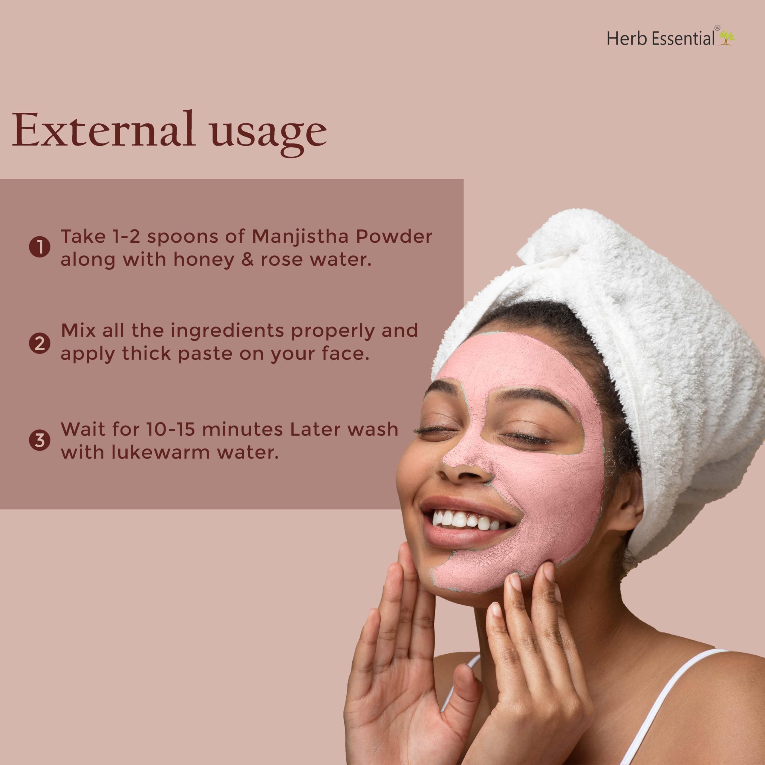 Usage on Skin : Take 2-3 tablespoons of Manjistha Powder and mix it with honey or rose water to form a thick paste. Apply the paste onto your face then wash your face with fresh water. That's it the secret to glowing skin!