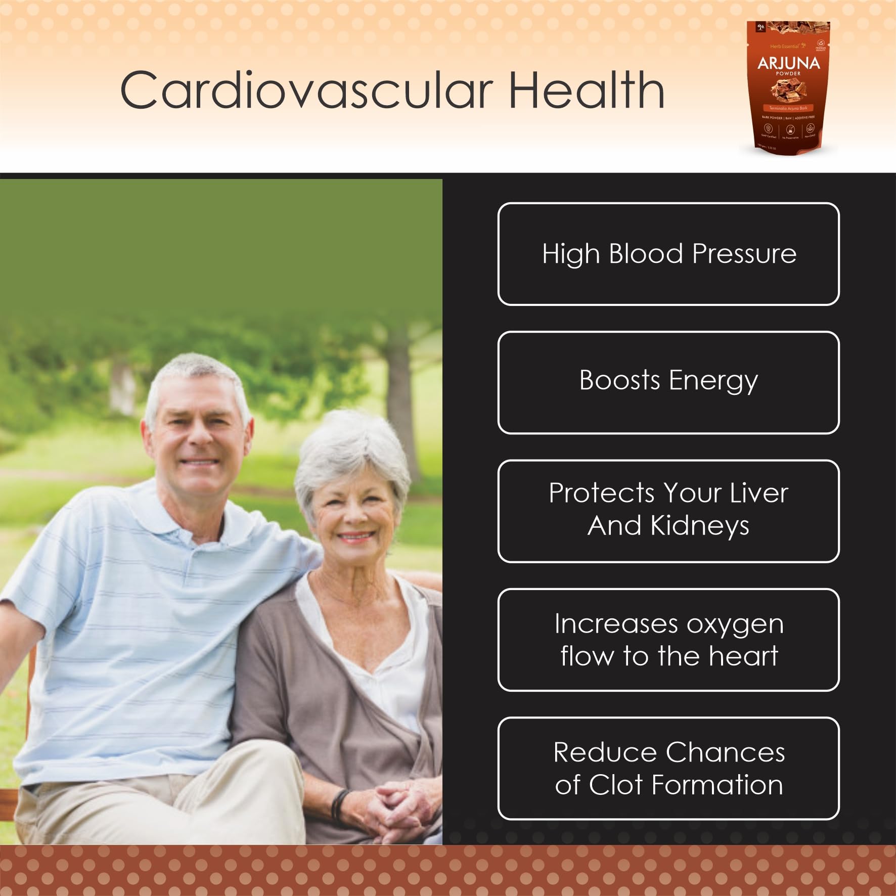 Arjuna (Terminalia Arjuna) is a tree bark that is used in Ayurveda since thousands of years for the purposes of cardiovascular health. It Helps to maintain normal blood pressure & strengthens heart muscles.
