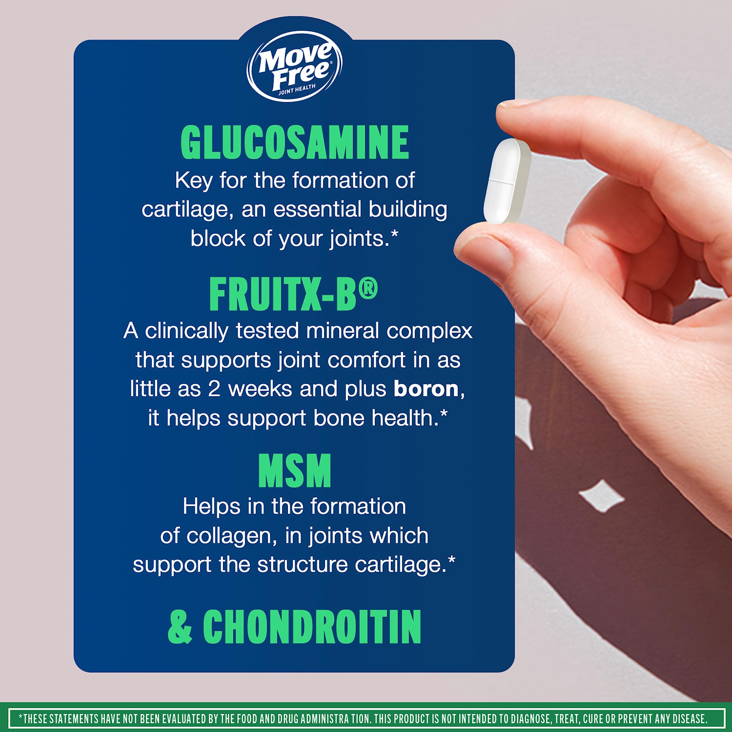 Move Free Advanced + MSM combines heritage joint support ingredients with the clinically studied mineral complex Uniflex. Uniflex has been shown to help support joint comfort in as little as 14 days.* Move Free Advanced + MSM contains Glucosamine Chondroitin Uniflex and MSM to help support joint mobility comfort strength flexibility and lubrication.* PLUS it provides extra cartilage support! WHY GLUCOSAMINE: Glucosamine is key for the formation of cartilage (essential building block of joints). Glucosamine helps contribute to healthy joint fluid that supports joint lubrication and smooth movement. It also supports the joint comfort mobility and flexibility you want in everyday life. WHY CHONDROITIN: Chondroitin is a building block of cartilage that supports joint strength by helping to resist compression in the joints. In the body Chondroitin functions by attracting fluid to joints to support cushioning and lubrication. WHY MSM: Methylsulfonylmethane (MSM) is a souce of sulfur found in the body that is important in the formation of collagen in joints. Collagen is a vital part of your joints because it supports the structure of cartilage. *These statements have not been evaluated by the Food and Drug Administration. This product is not intended to diagnose treat cure or prevent any disease.