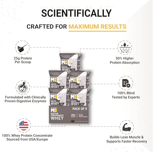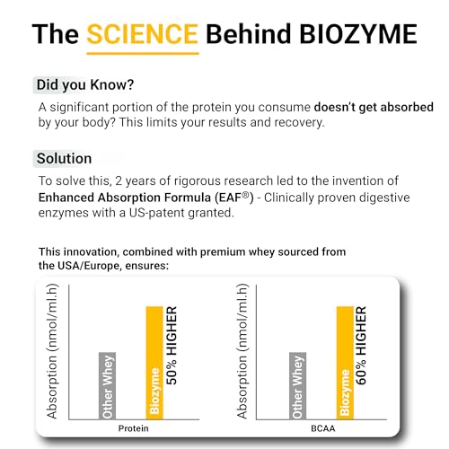 • ENHANCED ABSORPTION FORMULA (EAF): MB Biozyme Performance Whey Protein ensures 50% higher protein absorption & 60% superior BCAA absorption compared to other whey protein supplements. This proprietary formulation of MB is international patent-applied & lo