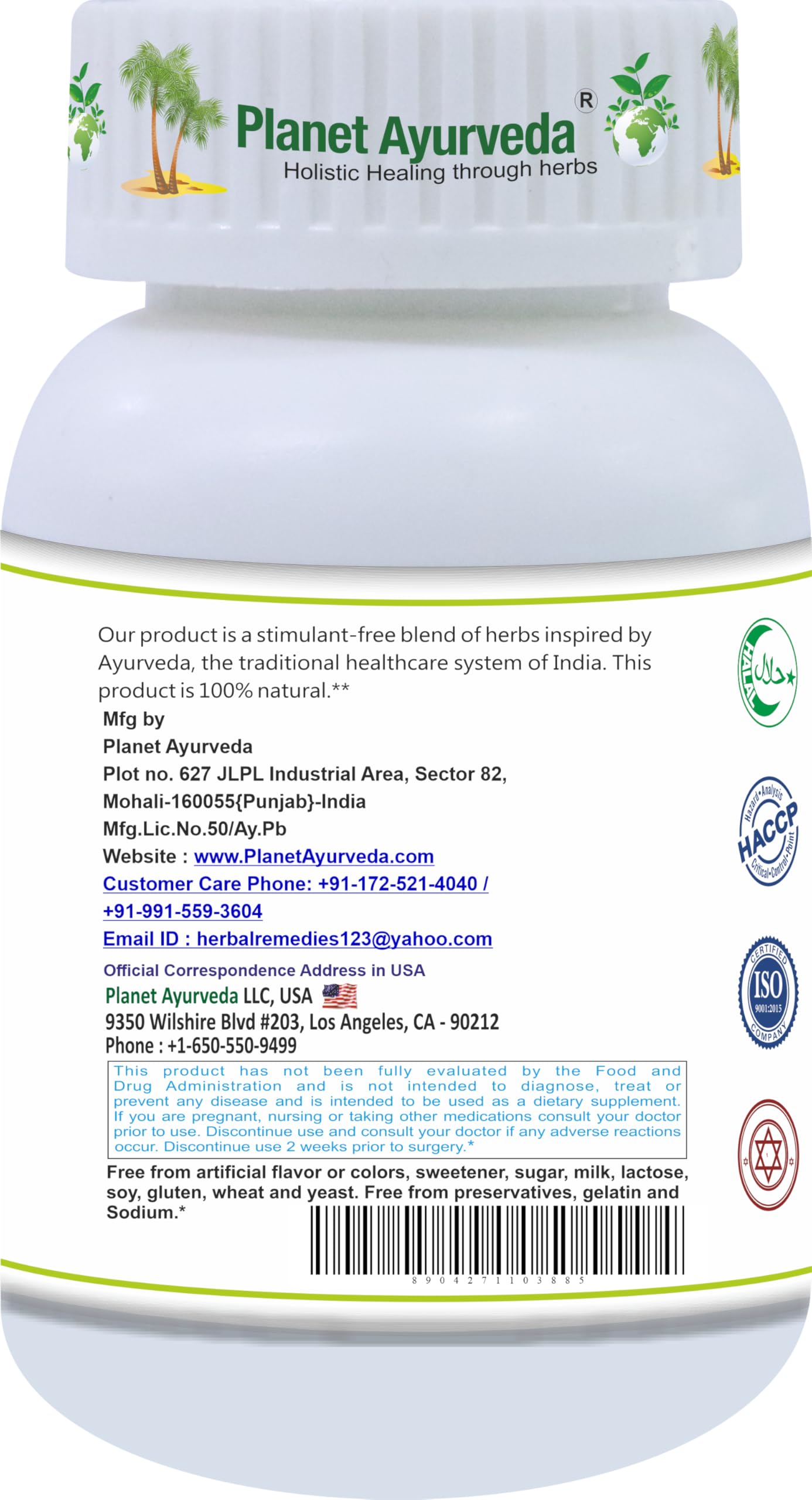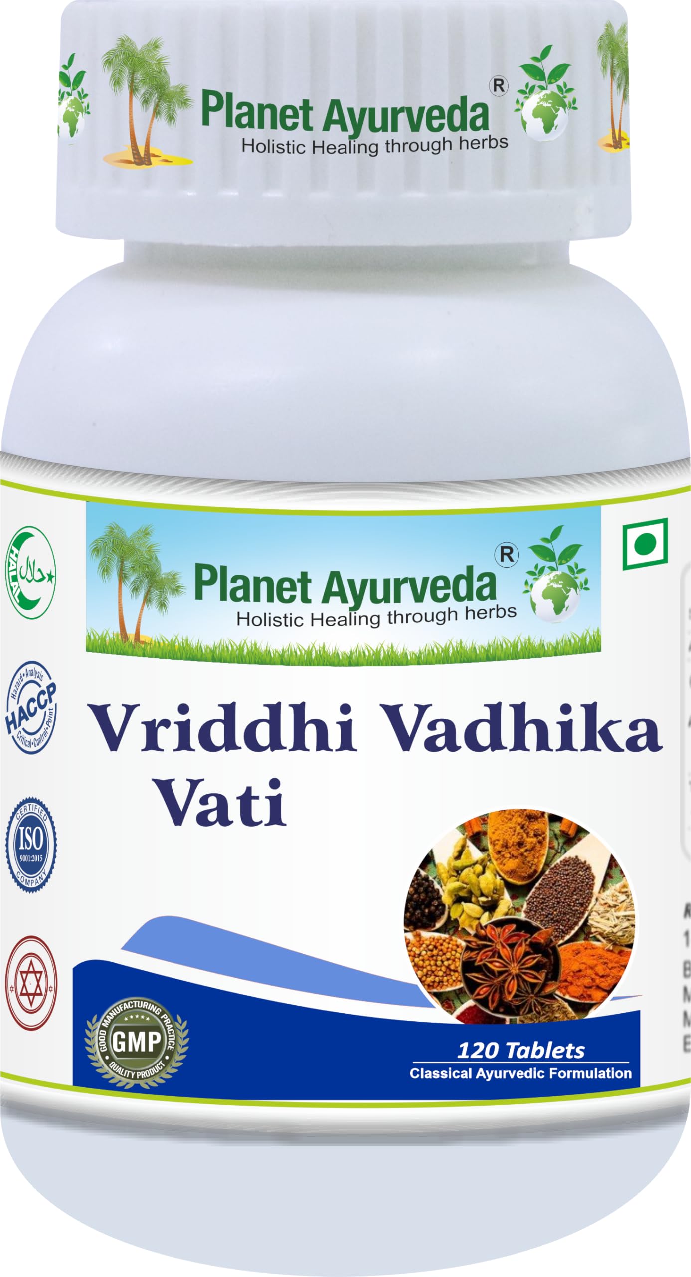Discover the benefits of VRIDDHI VADHIKA VATI a classical Ayurvedic supplement by Planet Ayurveda. This plant-based supplement comes in a package of 120 tablets each weighing 70 grams. The key ingredients include purified Mercury Sulphur Iron calx Tin calx Copper calx Bronze calx arsenic copper sulphate Pearl calx Corrie shells bhasma and a blend of various herbal powders. These tablets are to be taken 1-2 times a day depending on your health practitioner's recommendation. VRIDDHI VADHIKA VATI is designed to manage unwanted growth in the body support healthy blood circulation and promote digestive health. It is free from chemicals preservatives starch additives colors yeast binders and fillers. Experience the goodness of Ayurveda with this natural supplement.
