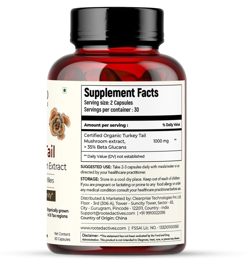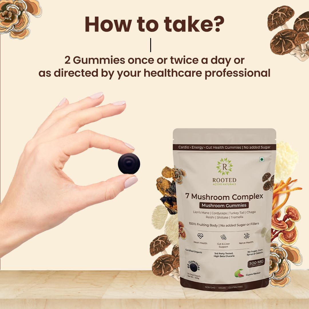 Support your gut liver and immune system with Rooted Active Naturals Turkey Tail Capsules and 7 Complex Gummiesa powerful combination of organic mushroom extracts designed for daily wellness. Turkey Tail Capsules (60 Caps) Made from 100% fruiting body extract rich in beta-glucans to promote gut health liver function and immune balance. 7 Complex Gummies (60 Gummies) A sugar-free guava-flavored gummy featuring Lion Mane Cordyceps Turkey Tail Reishi Chaga Shiitake and Tremella for full-spectrum support.
