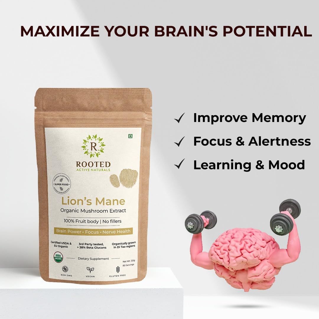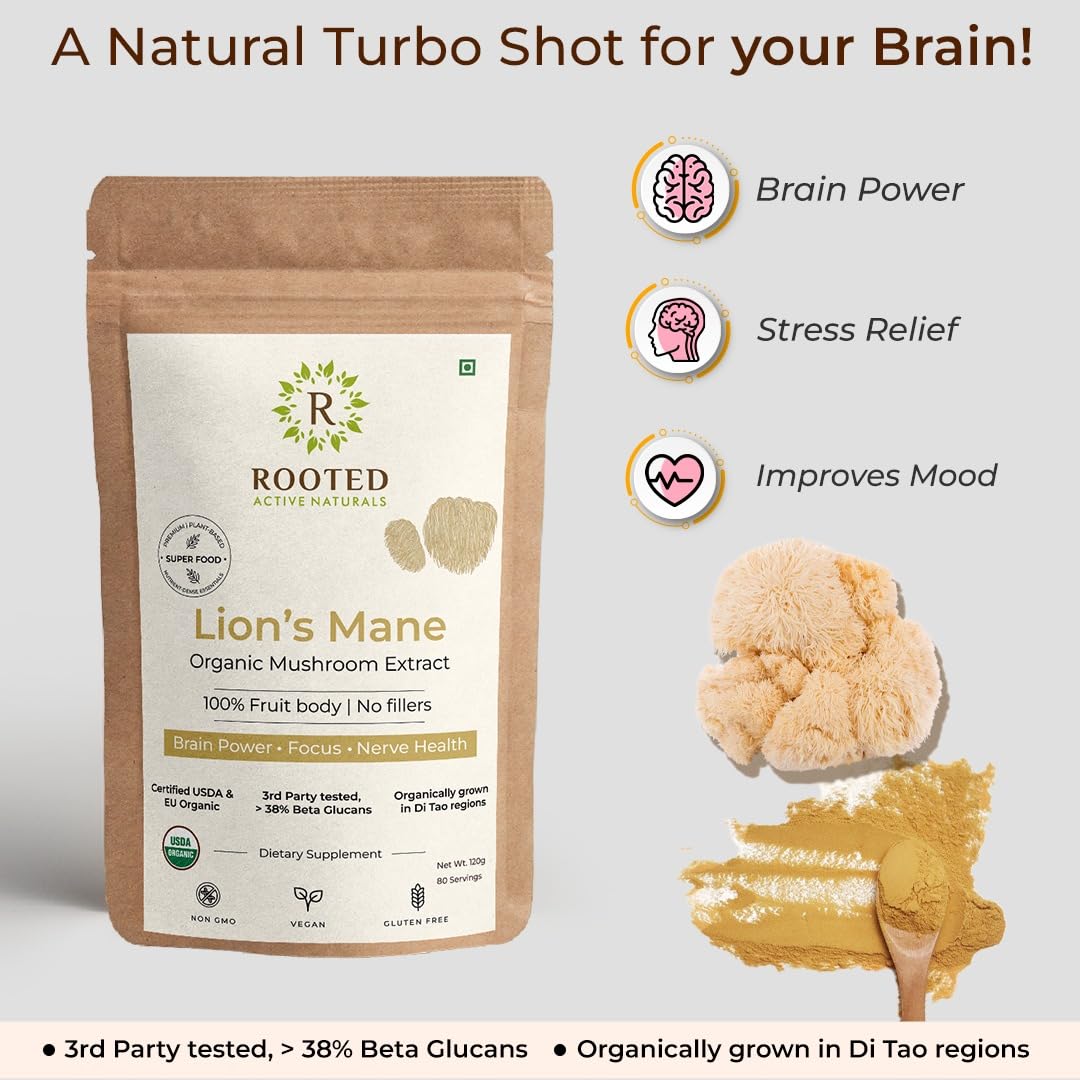 Rooted Active Lion Mane Mushroom Powder (Pack of 4 60g each) is a premium-quality mushroom powder made without artificial additives. This finely ground mushroom powder is ideal for mixing into smoothies coffee shakes or recipes offering a natural and convenient addition to your diet. This plant-based powder is carefully processed to retain its natural composition. It is vegan gluten-free and non-GMO making it suitable for those looking for a clean-label product.