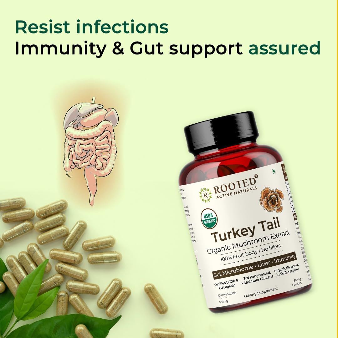 Rooted Active Turkey Tail Mushroom Capsules (Pack of 4 60 caps each) contain 100% whole mushroom powder carefully sourced and processed for quality. These vegan non-GMO and gluten-free capsules are free from artificial fillers or additives offering a clean-label choice. Designed for convenience these capsules require no mixing or brewingsimply take with water. The bulk pack of 4 provides great value and an extended supply for consistent use.