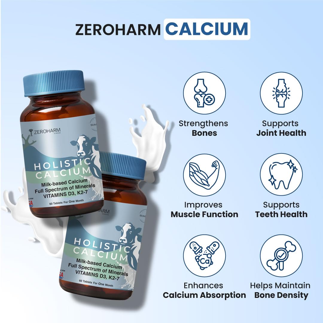 ZEROHARM Holistic Calcium Tablets High Absorbption Milk-Based Calcium Supplement with Vitamin D3 K2-7 Magnesium Phosphorous Supports Bone Strength & Joint Health For Men & Women 120 Tablets