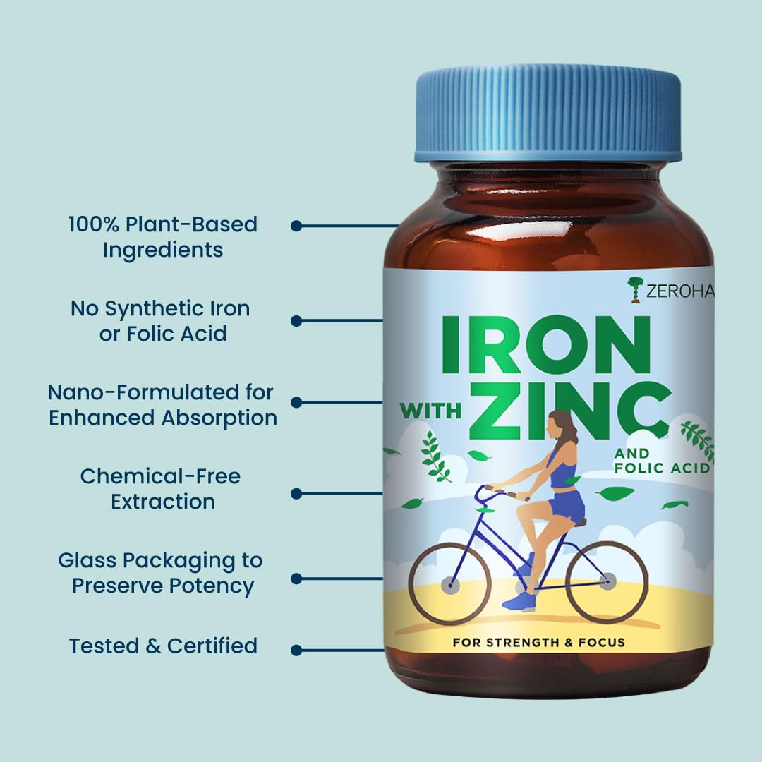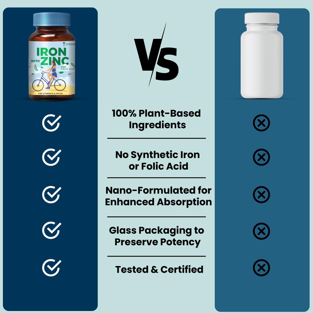 ZEROHARM Iron Zinc Folic Acid & B12 Tablets - Nano Formulated for High Absorption - Energy Immunity Skin Hair & Daily Wellness Support - Plant Based Supplement for Men Women - 60 Tablets - 2 Pack