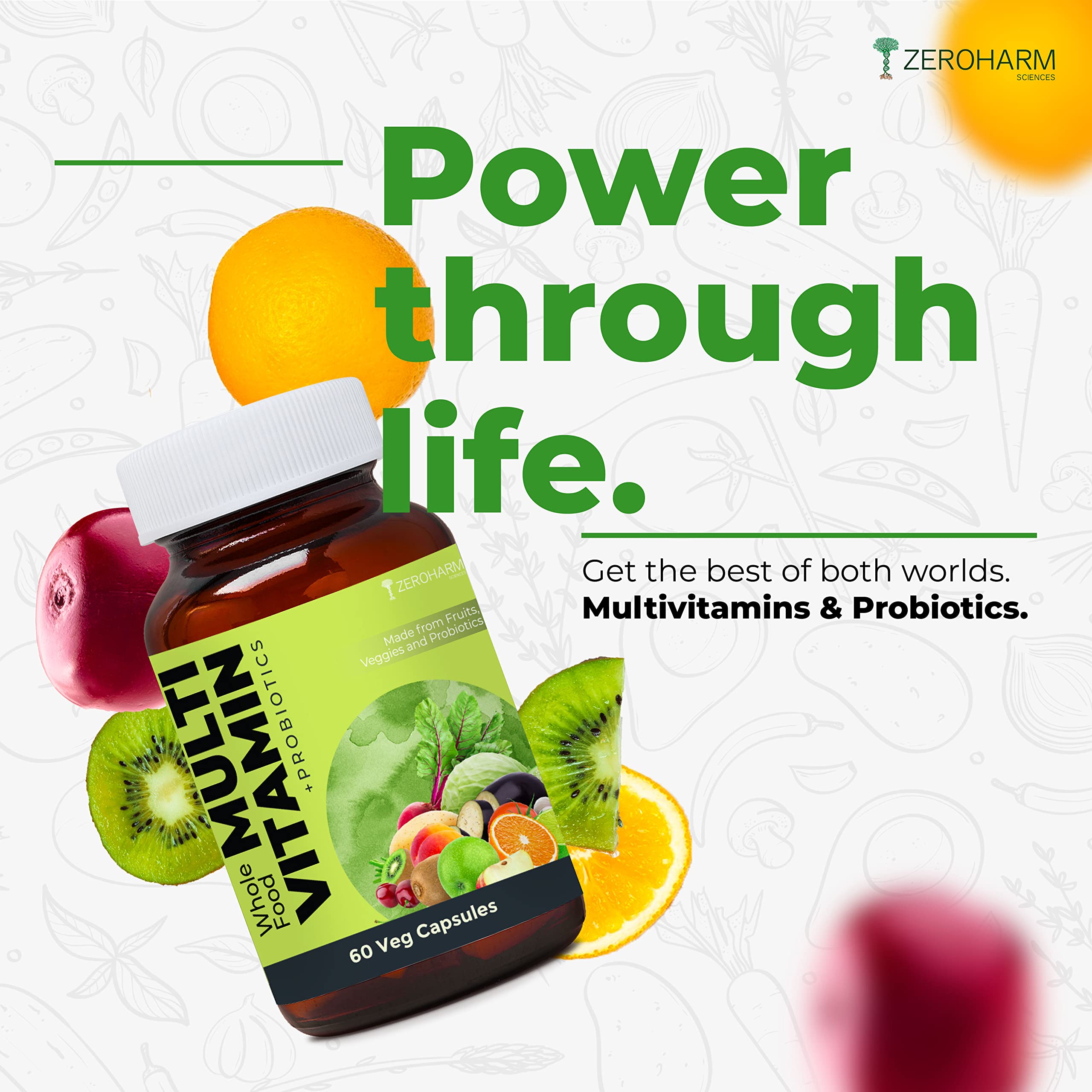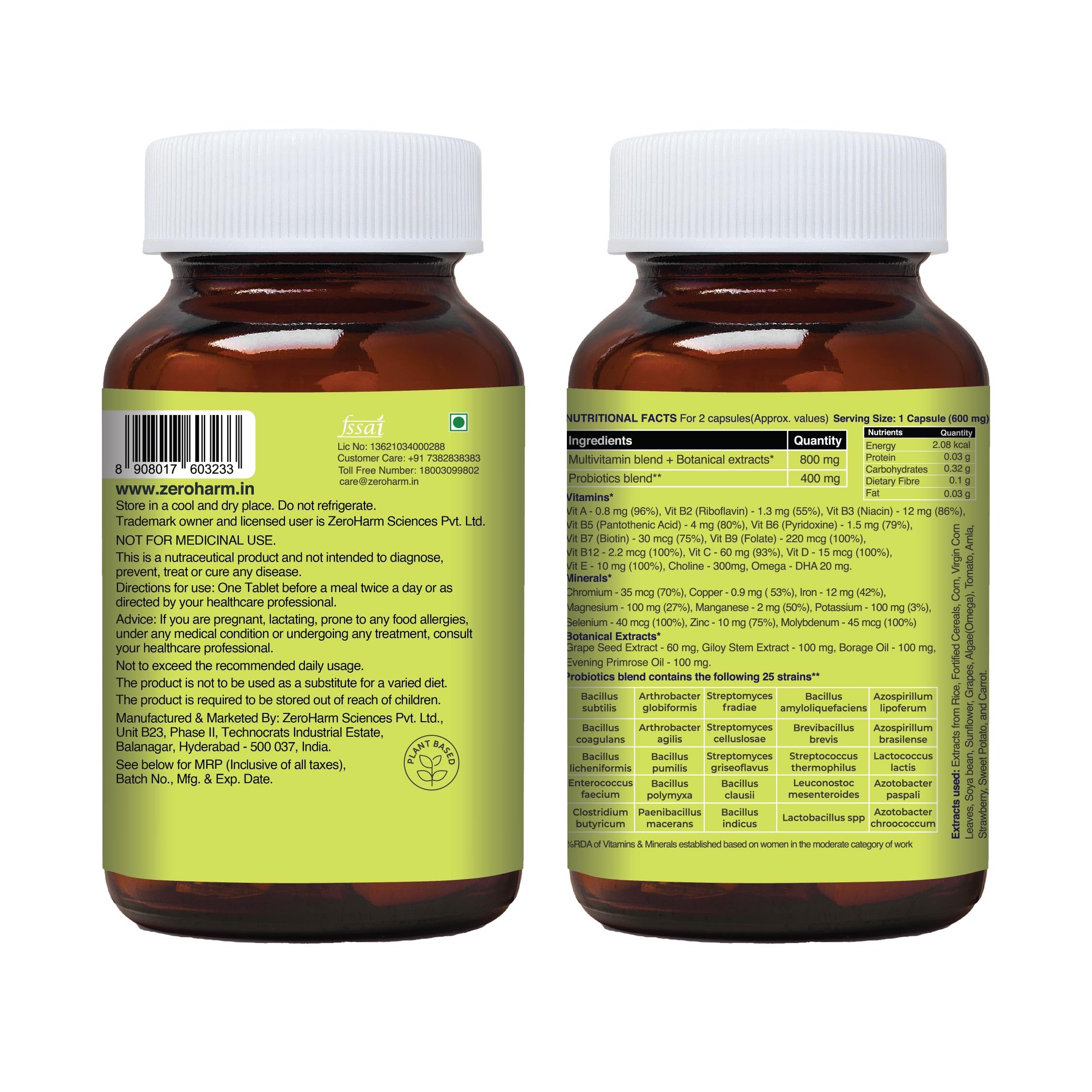 ZEROHARM Multivitamin + Probiotics for Men & Women - Plant-Based Daily Supplement with 25 Probiotic Strains - Boosts Immunity Energy & Digestion - Whole Food Vitamins & Minerals - 60 Veg Capsules