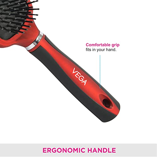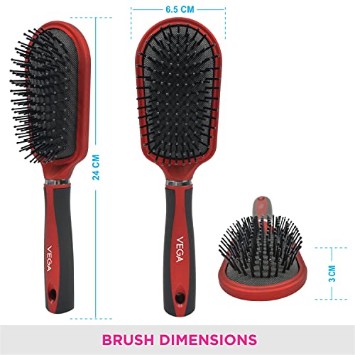 Ideal for grooming straightening and smoothing hair increasing shine cushioned. Nylon bristles with stay- put ball tips easily penetrate the hair and stimulate massage the scalp and also helps to reduce snags and tangles. Suitable for all types of medium to long hair.