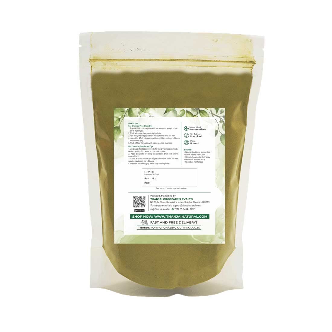 Thanjai Natural Indigo Powder is a natural dye that is very useful nowadays for coloring hair black naturally. It is common people known as black henna but it gives a blue dye. When used with natural henna powder it gives a dark brown to shiny black color. Generally it gives a blue dye even though it looks just like henna. It is also used to dye clothes and get a denim blue color. The Indigo powder is made using the leaves of the indigo plant.
