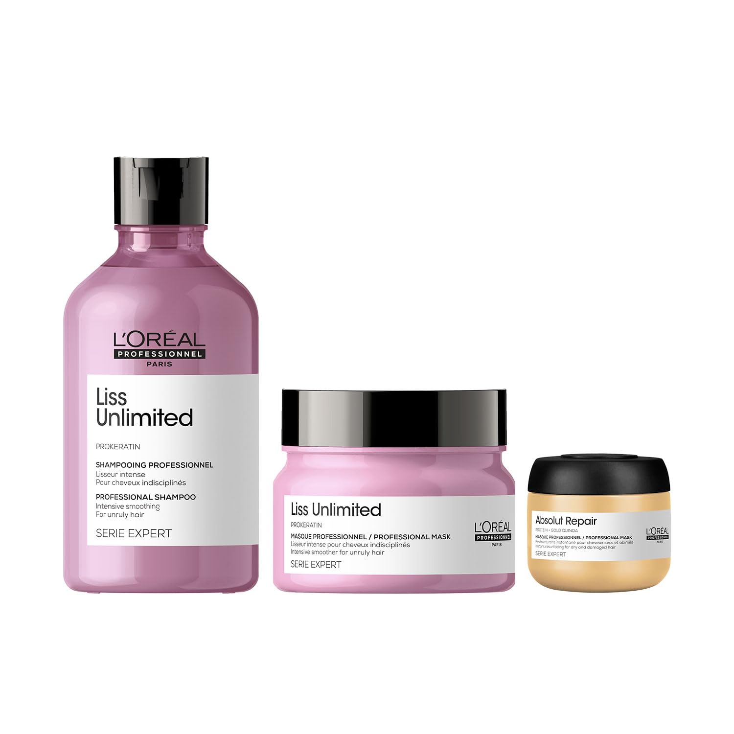 L'Oreal Professionnel Liss Unlimited Shampoo 300ml and Hair Mask 250gm Combo for Rebellious Frizzy Hair Serie Expert (Pack of 2) with Absolut Repair Travel-Size Mask 75ml