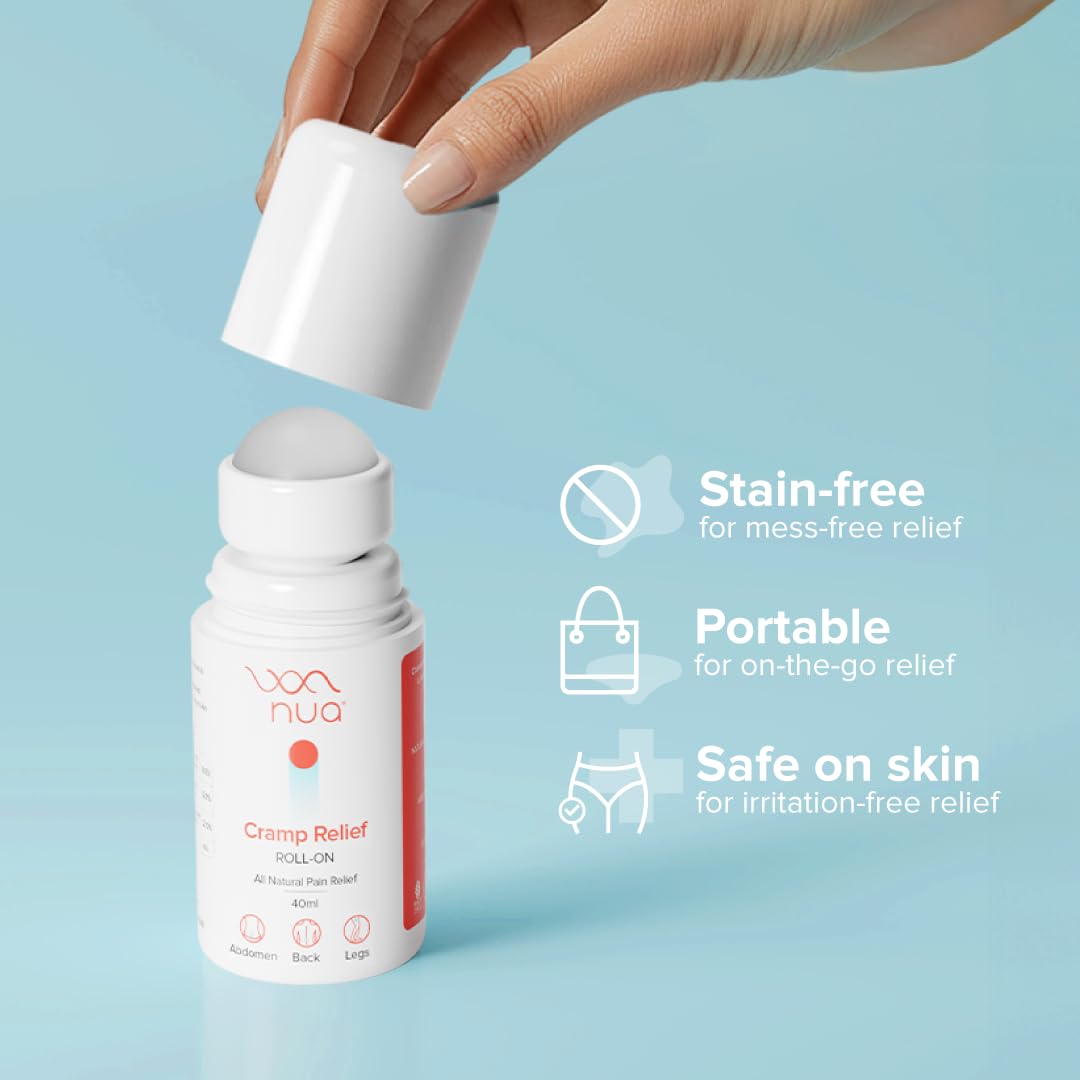 Cramp Relief Roll-On by Nua | Designed to be gentle and non-irritating, our formula is suitable for sensitive skin and offers comfortable pain relief without any risk of irritation or adverse reactions.