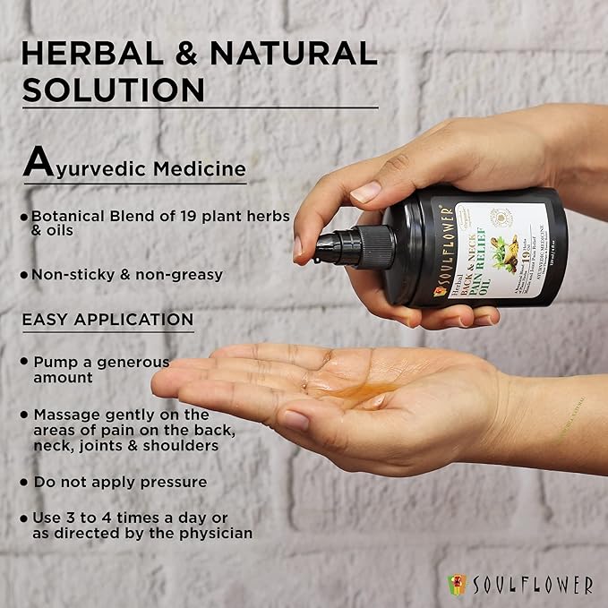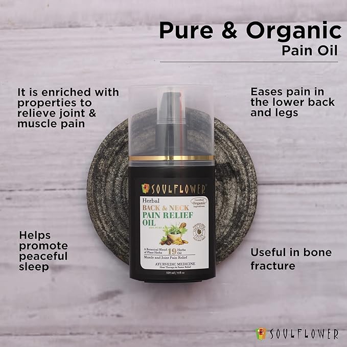 Soulflower Back Pain Relief Oil | Neck, Leg, Knee, Joint & Muscle Pain | Shatavari, Eucalyptus, Ayurvedic Botanical Blend of 19 Plant Herbs, Extracts, Certified Organic Ingredients, 120 ml
