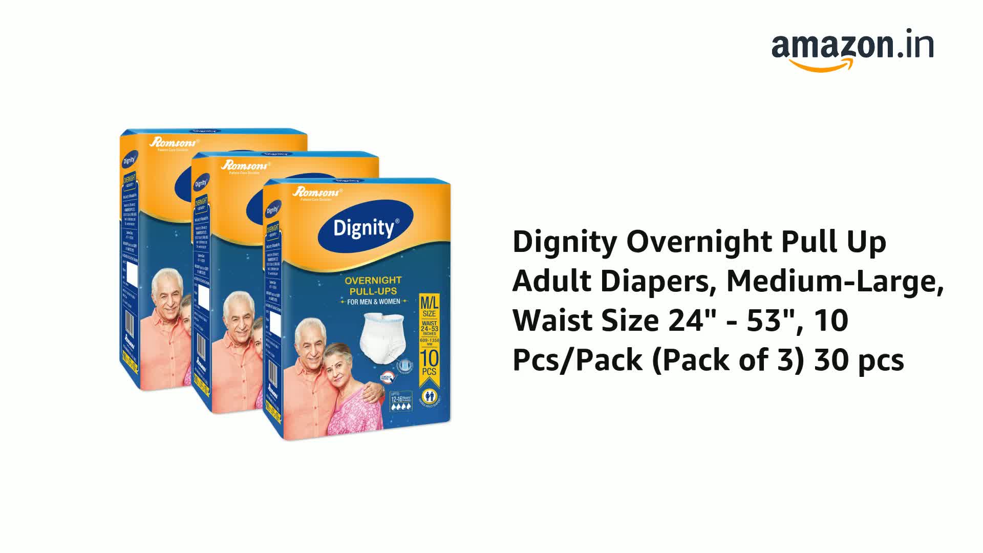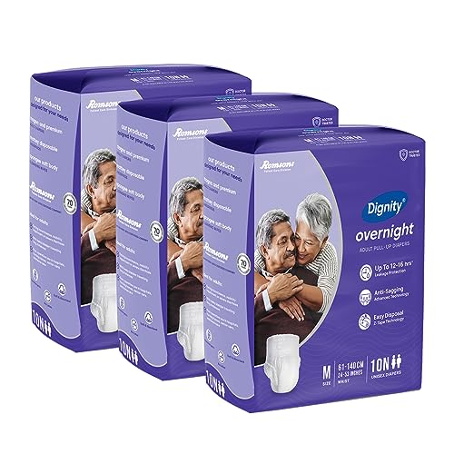 Dignity Overnight Pull Up Adult Diapers Pant Style - 30 Count (Medium) with Soft Elastic and Extra Absorbent Core, Waist Size 24" - 53", 10 Pcs/Pack (Pack of 3)