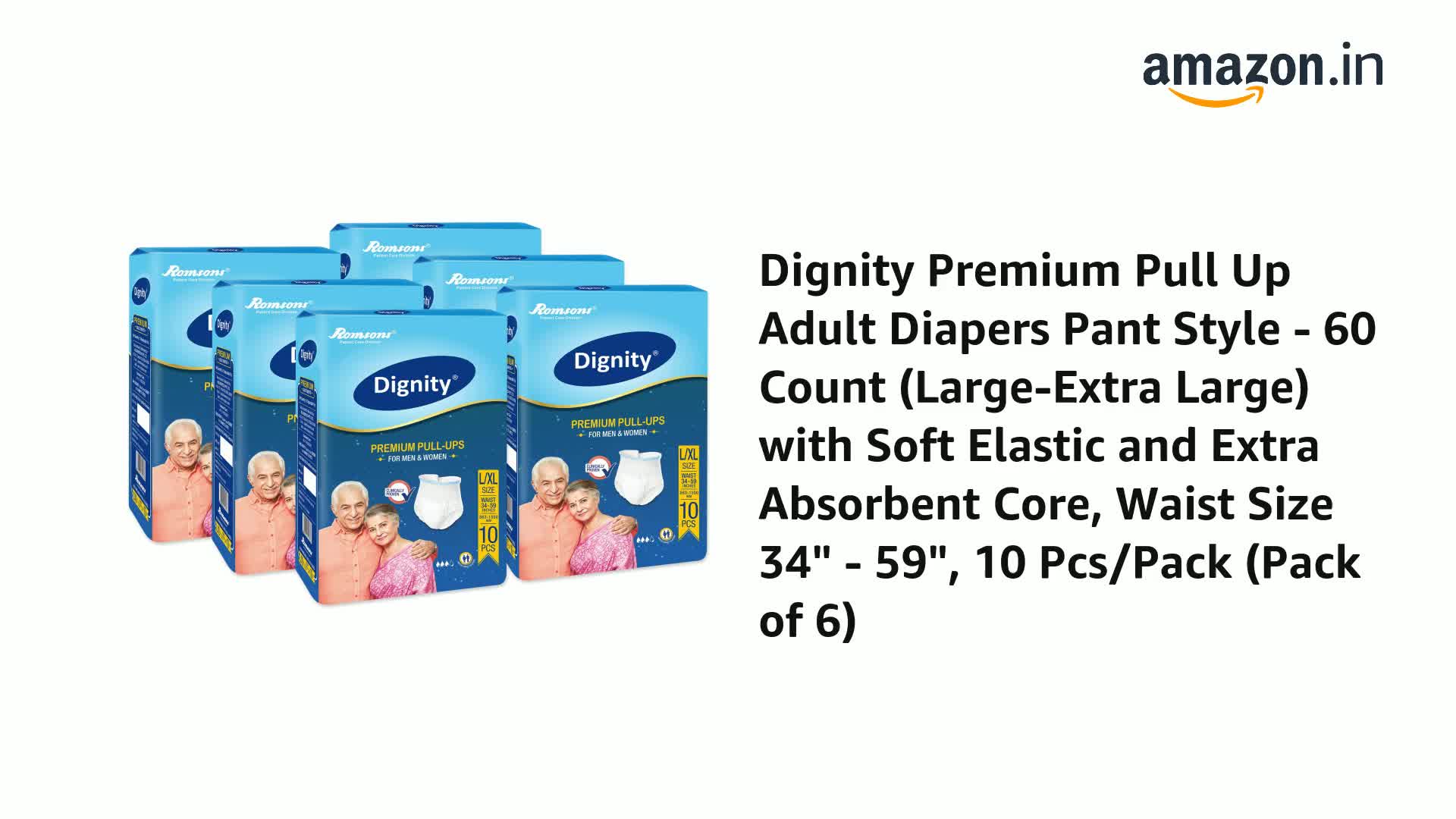 Dignity Premium Pull Up Adult Diapers Pant Style - 60 Count (Large) with Soft Elastic and Extra Absorbent Core, Waist Size 34" - 59", 10 Pcs/Pack (Pack of 6)