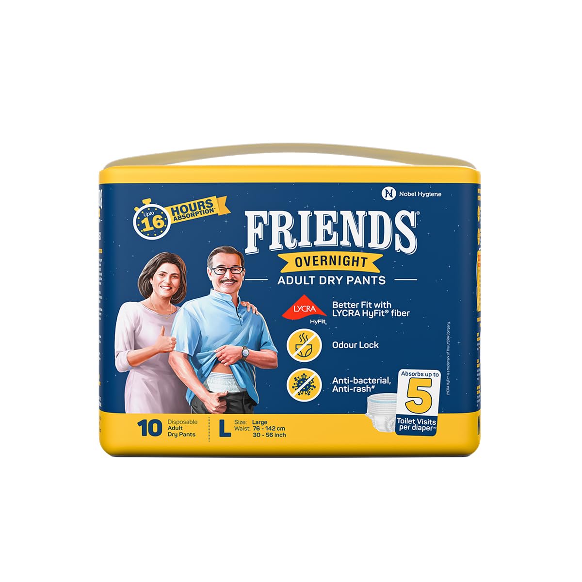 Friends Overnight Adult Diapers Pants Style - 10 Count (Large) with odour lock, Unisex, Leakproof, Elastic Waist and Anti-Bacterial Absorbent Core - Waist Size 30-56 Inch; 76-142 cm