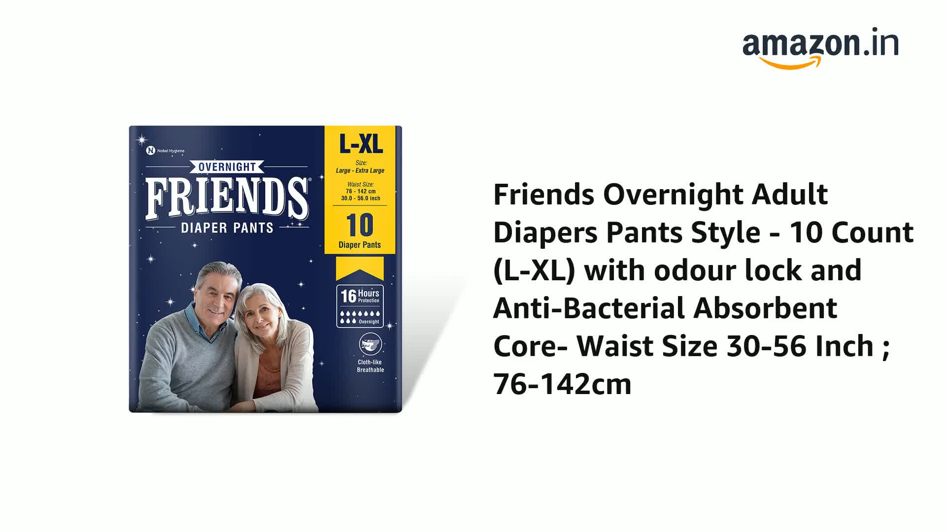 • Friends Adult Diaper Pants large size to extra-large size with up to 16 hours of protection are also available in sizes M-L and XL-XXL.