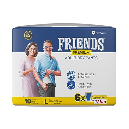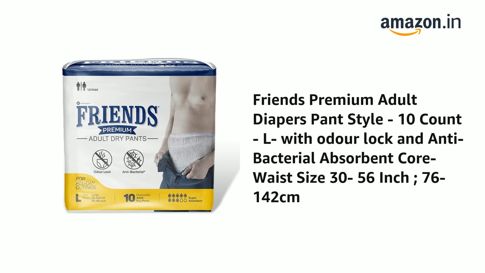 • Friends Adult Diapers large size in pant style with 12 hours of protection are also available in sizes M and XL.