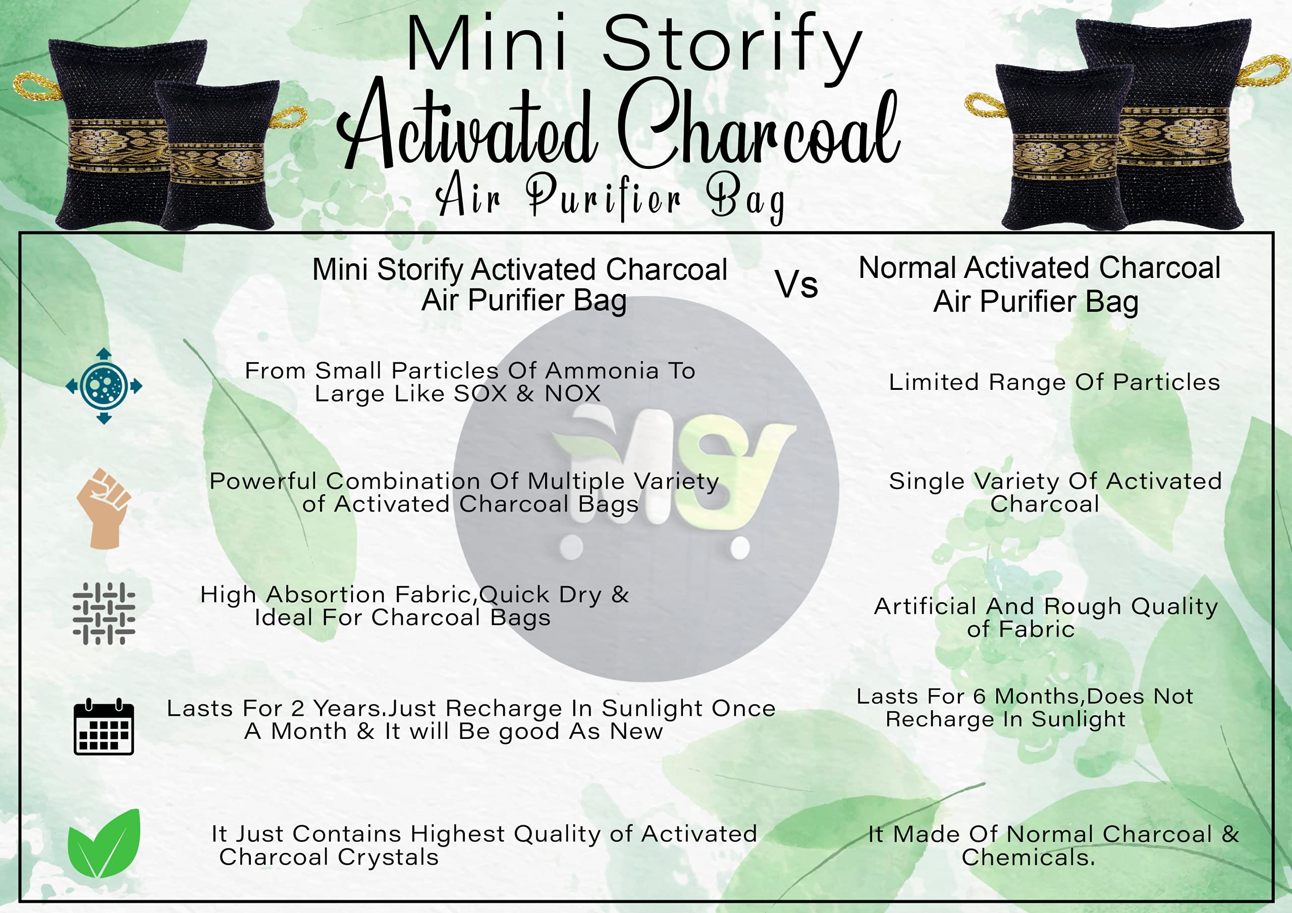 • MINI STORIFY ACTIVATED CHARCOAL AIR PURIFIER: an extremely effective air purifier that naturally absorbs odors ethylene and moisture. Filled with just one powerful ingredient activated charcoal the Mini Storify Bag will keep your fridge wardrobe car bathr