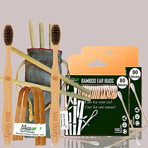 Mini Storify Truly Organic 2.Bamboo Cotton Ear buds / 160 Swabs,2.Adult Bamboo Tooth Brush ,2.Bamboo Tongue Cleaner,6.Bamboo Straw (8")(PACK-12)