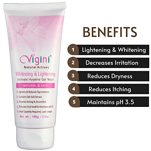 Vigini Intimate Lightening Whitening intimate wash serum cream gel contains natural actives to lighten color of intimate area by reducing hyper pigmentation melanin production & restore natural color of Intimate Part. Our intimate whitening lightening product prevents itching s Dryness Acts as a moisturizergives whitening Effective wash maintains pH 4.5 removes foul smell. Decreases Intimacy Inhibition . Vigini intimate feminine wash for women scores over Intimate Whitening lightening serum as wash cleanses and removes dead cells gives a feeling of cleanliness around intimate area.Unlike intimate lightening cream which stays on longer duration on the skin . Vigini Intimate whitening lightening wash gel gives a clean bright feel of Intimate area.