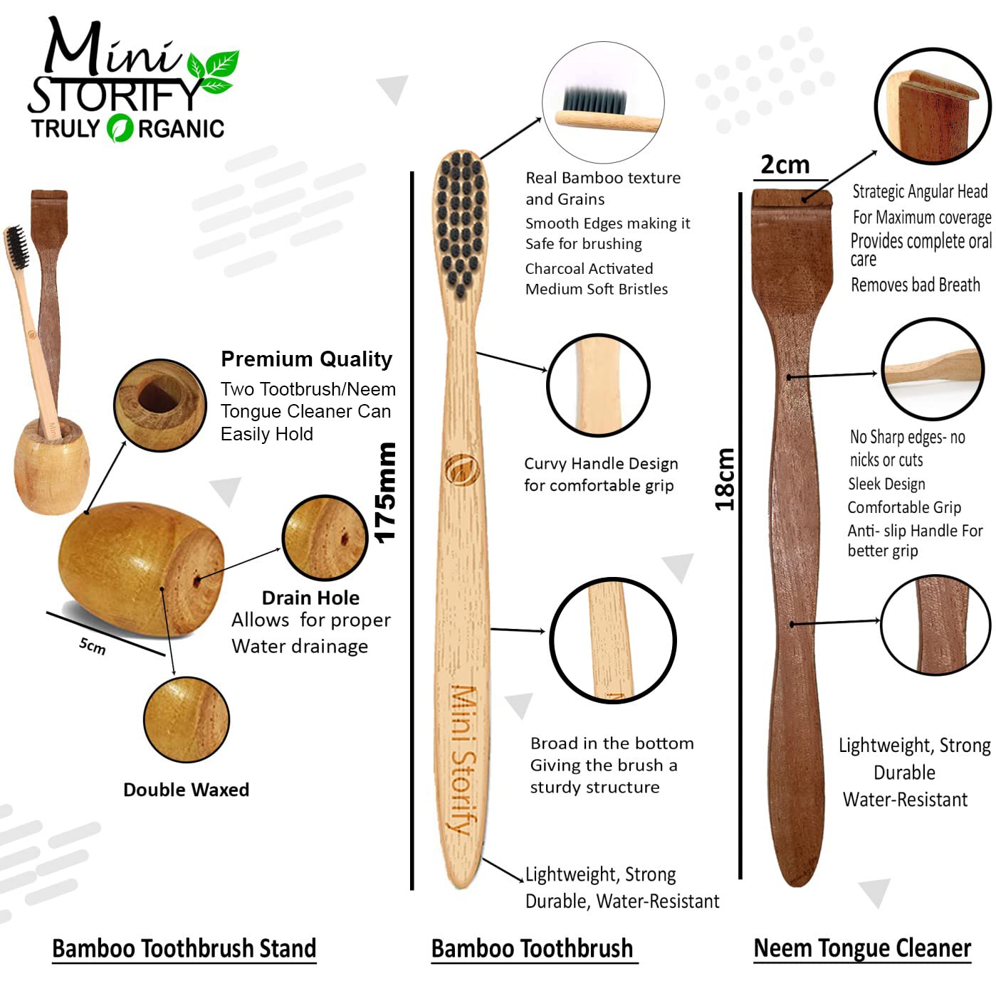 • Mini Storify Truly organic bamboo wood holder gives you a aesthetic look of bathroom this handcrafted holder crafted to keep either two brush or one neem / bamboo charcoal brush with tongue cleaner. It is durable sustainable wet free, bpa free, stains fre