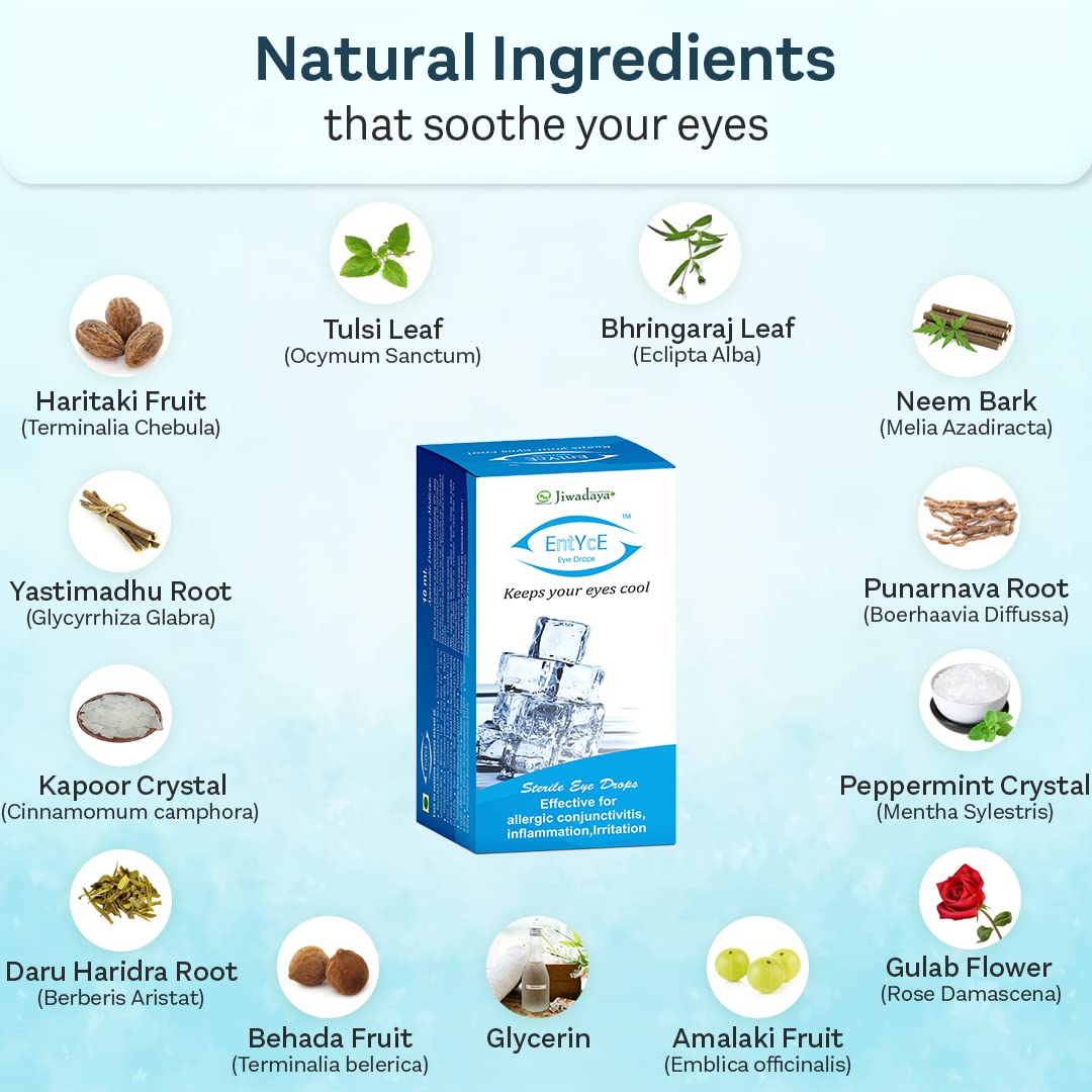 Unique and perfect blend of nature's most efficacious ingredients contaning an extraordinary combination of Triphala Nimb bark Tulsi Punarnava etc. Peppermint and Kapoor provide cooling effect to eyes