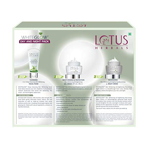 Lotus Herbals White Glow Day And Night Pack with free Face wash220gmThe WhiteGlow Day and Night Pack is a perfect start to your day right from cleansing to moisturisation and skin whitening ending with soothing night nourishment. WhiteGlow 3 in 1 Deep Cleansing Facial Foam -( Net Qty -100G ) is specially curated to cleanse the skin deeply. It is a hydrating super gentle cleanser that gets right to work washing away dirt makeup and excess oil. WhiteGlow Skin Brightening Gel Creame -( Net Qty -60G ) is the best skin whitening cream that delightfully blends into the skin leaving it smooth radiant and hydrated all day long. The SPF 25 provides much-needed sun protection too. WhiteGlow Skin Brightening and Nourishing Night Creme -( Net Qty -60G ) is a perfect leave-in night treat for tired skin as it strengthens the skin barrier promotes cell growth and enhances your glow.Lotus Herbals White Glow Oatmeal And Yogurt Skin Whitening Scrub 100gMake your skin look naturally fair using the Lotus Herbals WhiteGlow Oatmeal and Yogurt Skin Whitening Scrub. It is specially designed to make your skin look clearer and fair. Powerful Natural Ingredients This skin whitening scrub is infused with oatmeal and yogurt enzymes that offer a gentle exfoliating action to remove dead skin cells. In addition these enzymes help lift off dirt impurities oil blackheads and whiteheads from the pores leaving the skin clean clear and spotless. They even out your skin tone while preventing dull skin and discoloration. Keeps your Skin Moisturised Oatmeal also hydrates your skin and locks in the moisture. Yogurt helps prevent the skin from tanning and ageing. This Lotus Herbals skin whitening scrub is suitable for normal dry combination and oil prone skin. It brightens your skin tone and gives a healthy glow. Directions for Use This skin whitening scrub comes in a convenient 100g tube. Squeeze a pea-sized amount of the scrub apply on wet face scrub and wash off with clean water. Get this Lotus Herbals WhiteGlow oatmeal and yogurt skin whitening scrub at Amazon India.