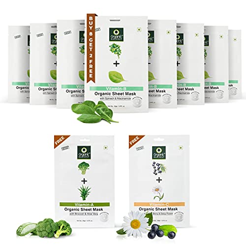 Organic Harvest Vitamin B Face Sheet Mask Pack of 8 & Get Free Vitamin A & Vitamin C Face Sheet Mask Suitable for All Skin Types 100% Organic (Sheet Mask 20gm Each Pack of 10)