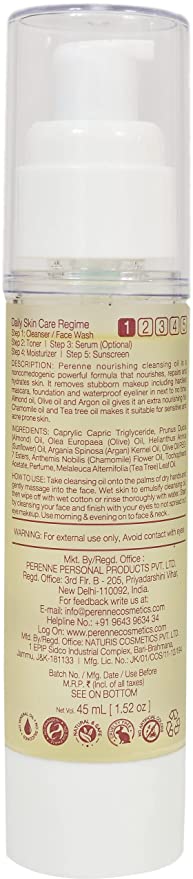 Perenne nourishing cleansing oil is a noncomedogenic powerful formula that nourishes, repairs and hydrates skin. It removes stubborn makeup including hardiest mascara, foundation and waterproof eyeliner in next to no time. Almond oil, Olive oil and argan oil in it give it an extra nourishing hit. Chamomile oil and tea tree oil makes it suitable for sensitive and acne-prone skin.