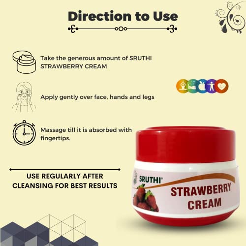 Direction to use: Apply Sruthi Strawberry Cream gently over face neck hands and legs daily after cleansing. For best results use daily.