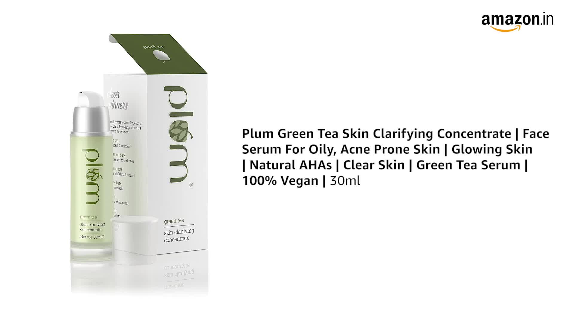 Clear skin this way when your skin is oily and acne-prone you need action on multiple fronts to clear things up. This 100 percent vegan hyper-concentrated serum helps clear up and brighten skin and prevent the appearance of fresh spots and blemishes in 5 different ways: Green Tea prevents oxidation of sebum one of the major causes of acne Alpha-hydroxy acids (AHAs) from 5 different plant sources promote skin renewal Cinnamon bark helps regulate sebum production naturally Willow bark contains salicylic acid that fights acne-causing microbes Licorice helps tackle hyper-pigmentation and clears up skin. Can be used twice daily as part of a regular skin care regime for oily and acne-prone skin. All Plum packaging is 100% recyclable. Once youve used up all the goodness in your Plum bottles send your empties to us and well recycle them! Just reach out to us on our customer care contact number or email id and share your complete address and contact number to request a pick-up.