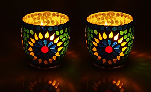 Karguzzari offers you a beautiful mosaic glass tea light candleholders. These are completely hand made with small glass pieces assembled in mosaic style. Place a tea light candle inside this votive and let glow of the vibrant rays create a peaceful ambience in any room of the house