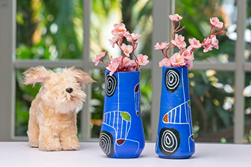Karru Krafft Handcrafted Terracotta Clay Geometric Printed Blue Flower Vase for Indoor / Home Decoration Set of 2 (19.05 x 10.16 x 19.05 cm)