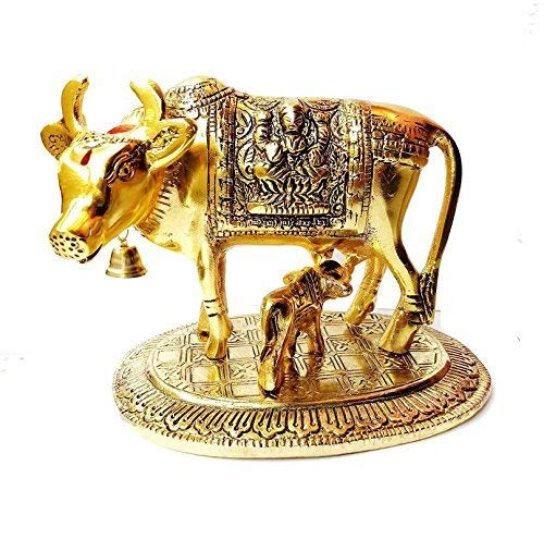 Prince Home Decor & Gifts brings you an unique antiques religious kamdhenu cow with calf with krishna standing on metal base. The product is gold plated with antique finish so looks very beautiful and use for the purpose of worship and for home decorative.Beautiful creation of kamdhenu cow & calf is a perfect symbol of the undying aura of the holy saint that encompasses numerous devotees round the globe. This statue aptly conveys the emotions of people who consider cow (gomatha) as a motherly figure. Kamdhenu cow & calf statues are widely used for decoration purposes in homes and offices. It serves as a great gift especially around religious celebrations and festivities. This white metal handicraft has been made by skilled artisans from the house of prince home decor & gifts using various traditional techniques. Add an element of spirituality to your home decor with this Showpiece Figurine. It could be a great gifting option for religious celebrations or festivals. Material : Crafted from Fine Quality Material this showpiece reflects the artistic brilliance and adds elegance to your home decor. For an Attractive Look : This Showpiece gives your home the great looks Care and Maintenance: Since it is made of Fine Quality Material it is easy to clean and maintain. You can clean it with a soft and dry cloth. Material : Aluminium It's design to looks traditional stylish and inspiration from the day's of royal touch that is made in white-metal casting with silver antiques finish white metal to bring elegance to your home. This is hand made handcrafted items use it to religious worship of god&goddess. That is use and utility items & an ideals gift it to your dear once to pass on your best wishes that is an ideal gift for have warming anniversaries birthday wedding gifts return gifts corporation gifts religious-gifts & indian festivals. . .