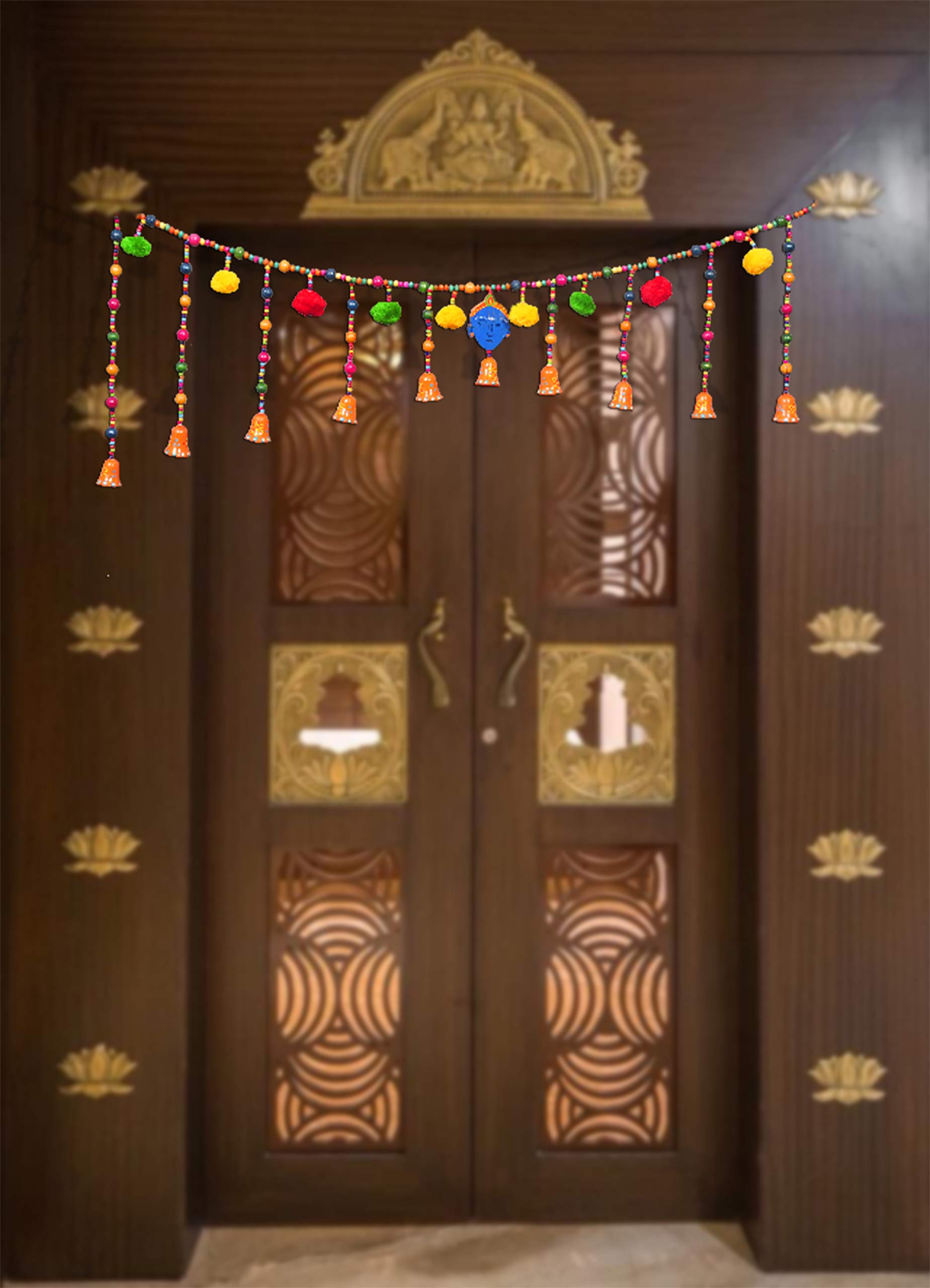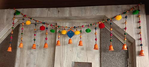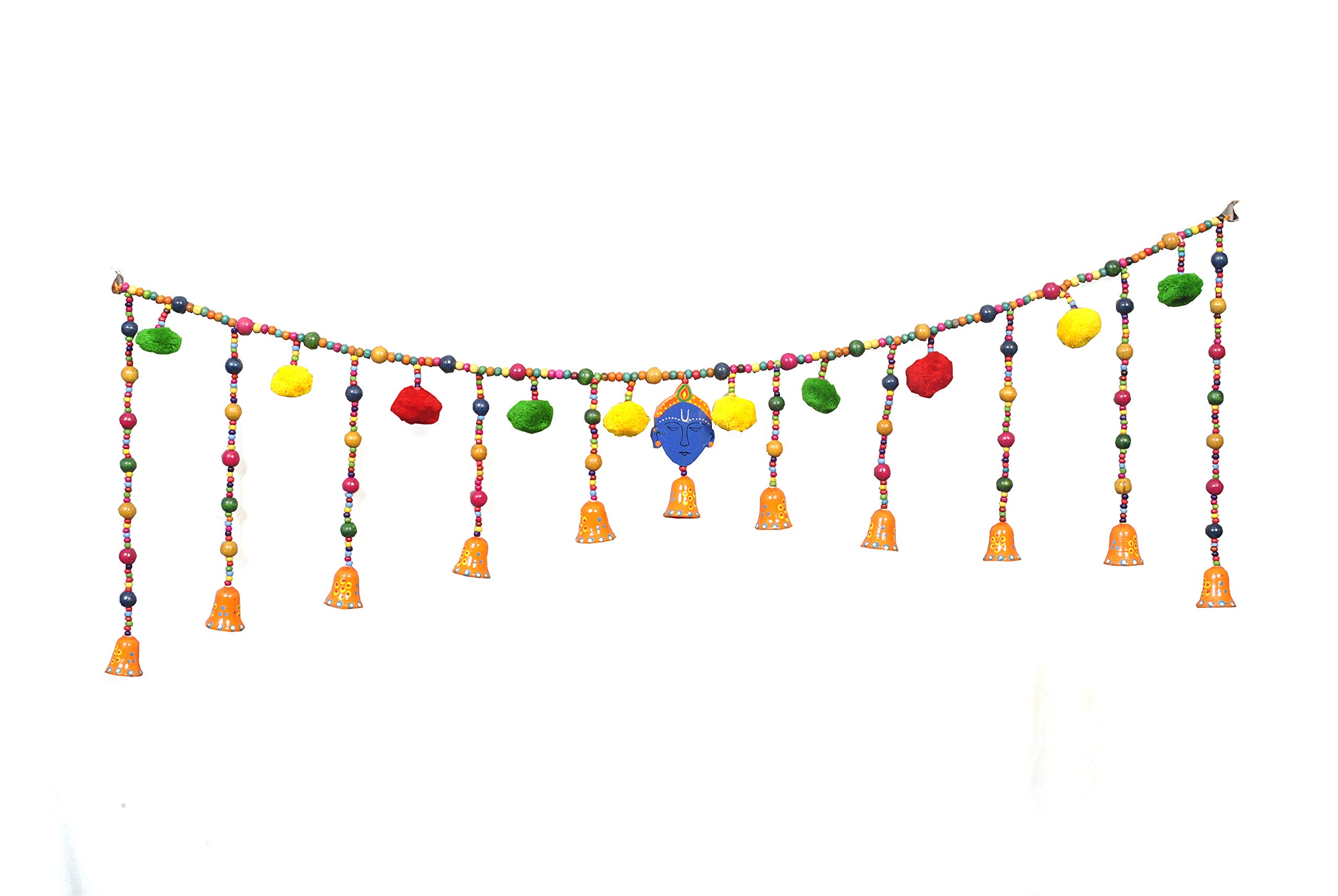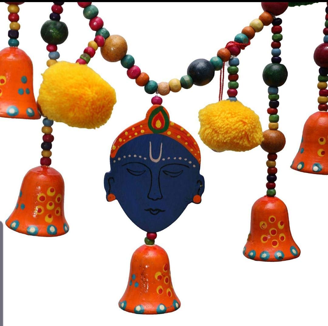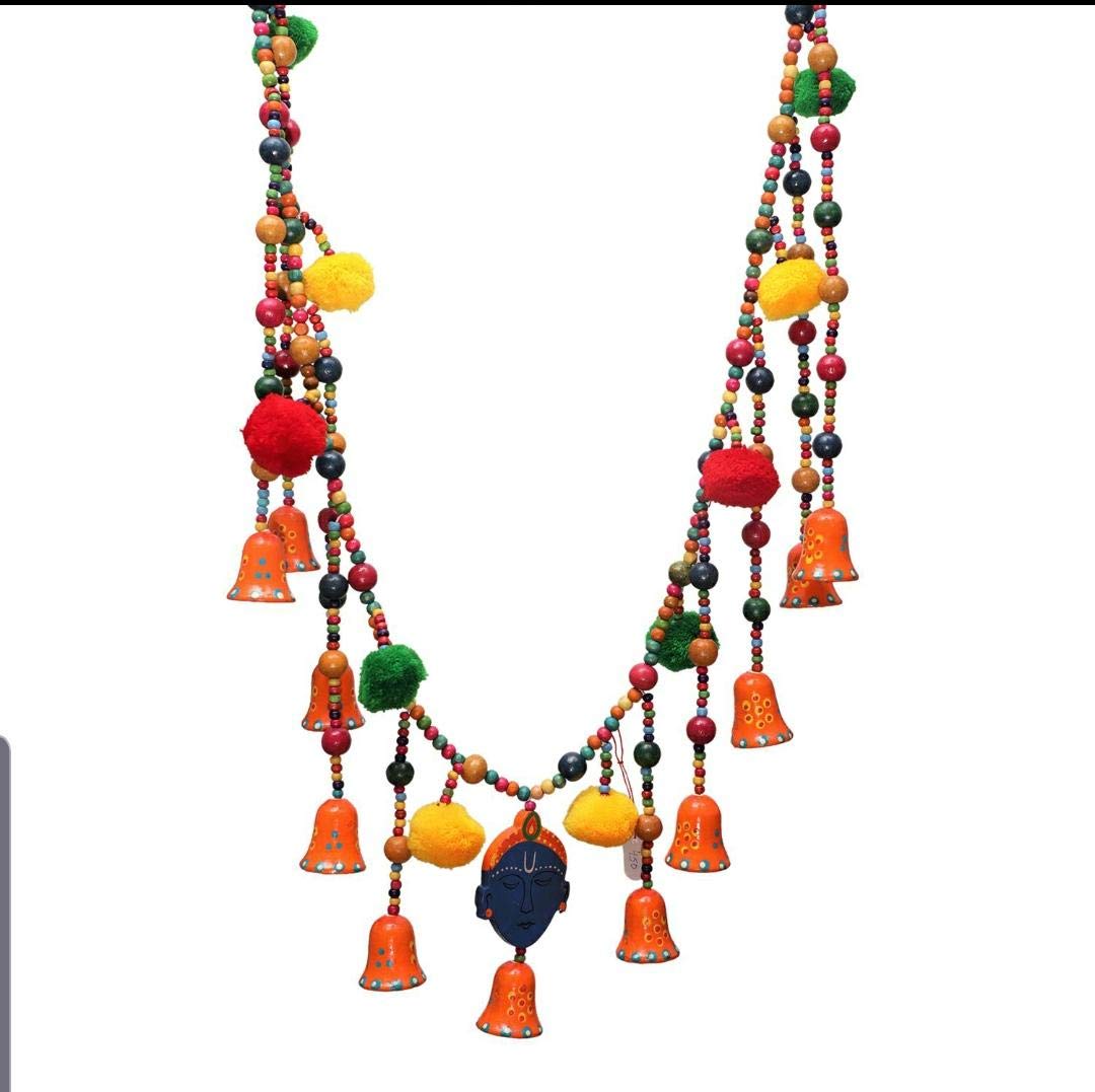 Torans are traditional decorative hangings that can be hanged on doors as well as walls and can be used on many occasions like Pooja Festivals House Warming Parties Marriages and inaugurations etc. An effortless way to add luster to your festive gala. These door hangings are perfect for creating a grand look for your main door; A symbol of happiness and charm. Unique Design Traditional Look Easy To Clean Durable Auspicious Economical. Suitable For Door Wall Pooja Area and Every Occasion. The ethnic embellishments are meant to bring the good spirits to your home and wind off the evil ones. This Artistically handcrafted Auspicious Bandanwaar Toran door hanging decorated with colorful wooden beads and Krishna face in the centre is perfect to be tied at the entrance of home or office to keep away negative energies and bring good luck. The beads and little bells complete the ethnicity of this Truly Auspicious Bandanwaar. Design is very unique & beautiful way that it adds a totally new dimension to your home worship place or office. Torans or bandanwaars are used to decorate the main entrance of the home. The main idea behind decorating the homes is to please and attract the goddess of wealth Lakshmiji. So the decoration of the entrance of the place is also important in this regard. The beautiful door hangings that are also known as bandanwaars and torans have special significance as the decoration accessories. These Torans are the first thing that welcomes your guests as they step at your place. These Torans not only enhance the charm of the main entrance of your home but also give a friendly welcome. Environment Friendly Material. Can also be an ideal and unique gifts for your loved ones on different occasions like Pooja Festivals House Warming Parties Marriages and inaugurations. Decorate your home/doors during the festive season and bring luck to you home with this attractive auspicious and elegant door hanging .