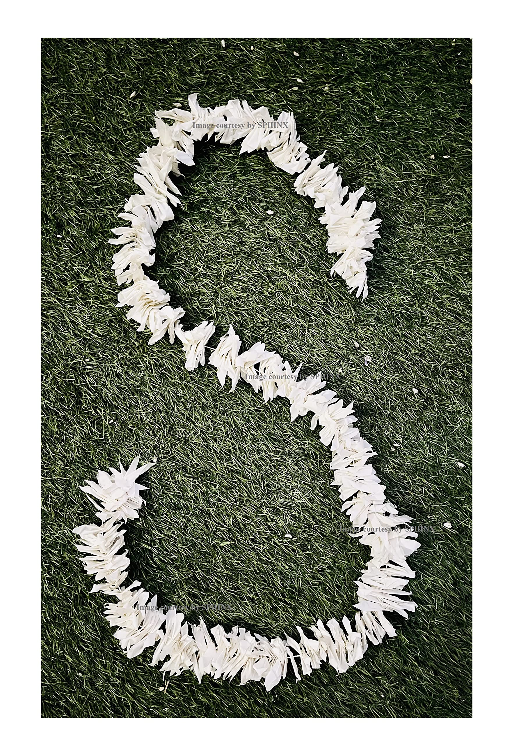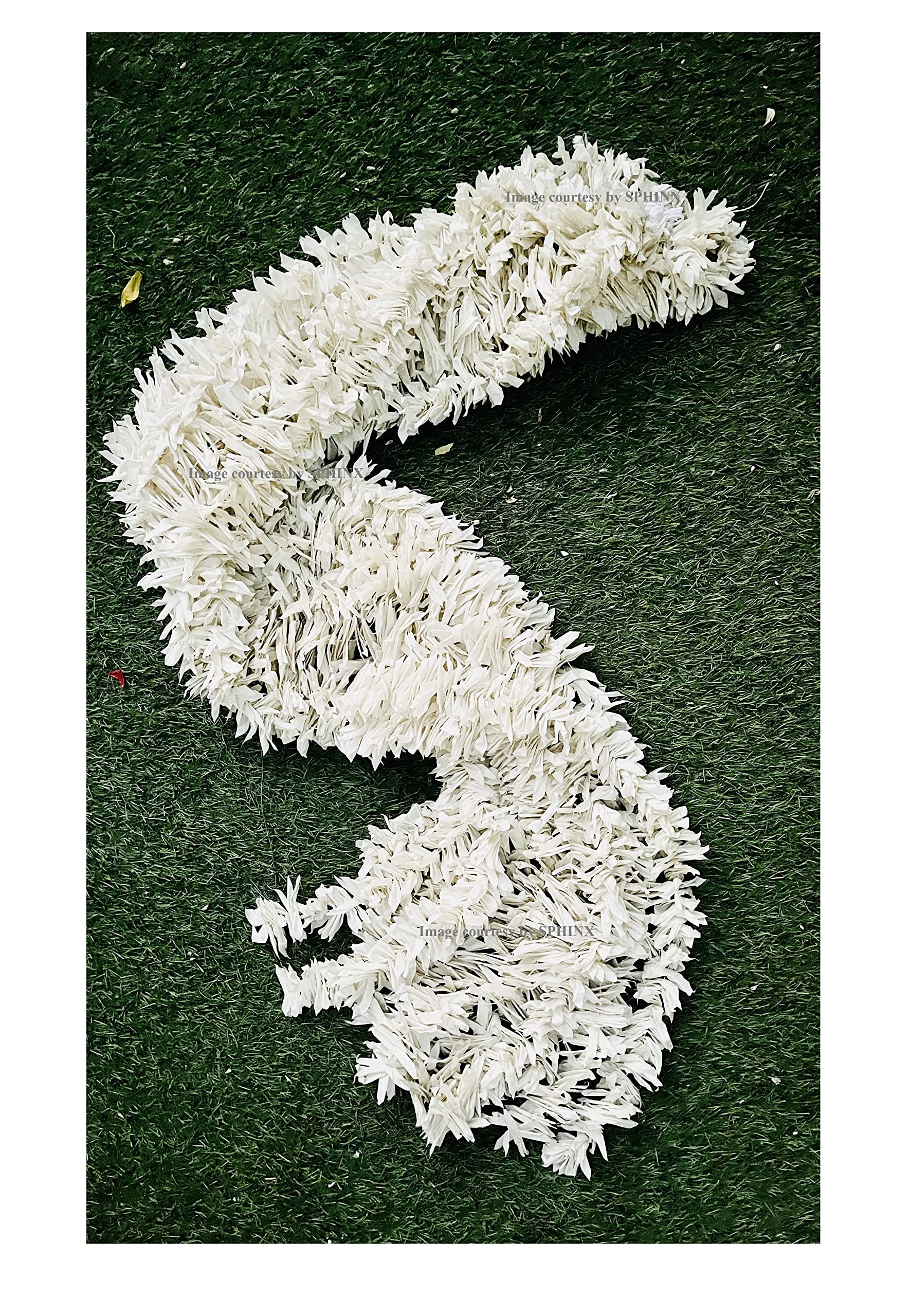 PACKAGE CONTAINS Artificial Jasmine white fabric mogra gajra decorative garlands as shown in image as per selected size and quantity. MATERIAL: Polyester/Fabric. It feels like plasto paper or waxed while touching but its Sturdy Polyester which is used to make garlands. BUILT UP: The garlands are loosely threaded/stringed generally. The overall density of the garland can be adjusted by user as per the requirement. These garlands are mostly preferred in loose threaded OR stringed form as its easier to accessorize the garlands with other floral items for decorations. However to make these denser user can simply pull the thread lightly to make the fabric parts closer. This gives denser look to the garland and thus reducing length. ABOUT PRODUCT: The garlands are called as Gajra Garlands. These are used for all sorts of decorations wall hangings accessory decorative garlands torans door entrance decorations floral rangoli etc. These garlands are Re-usable Re-fixable (if needed) Washable Sustainable. Apart from home decoration these garlands are also used for making hair accessory hence these are multipurpose decorative garlands. USAGE: The garlands can be used as stand-alone decorative pieces in their original loosely built up form or can be used with Sola lotus buds flowers golden bells creepers fluffy marigold etc.