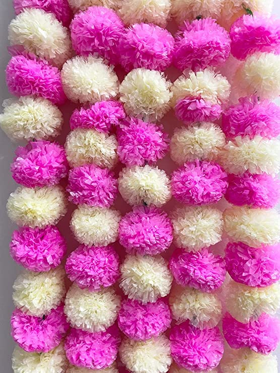 BriKSHi Artificial Marigold Flowers for Decoration Long Marigold Garlands for Decoration Toran Indian genda phool for Wedding & Festival |5 Feet Long (Pack of 5, White Pink)