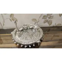 German Silver Hand Engraved Heavy Pooa Thali (Diameter 11) With Full Ghungru Layer And Elephant Legs Stand Set of 6 Items