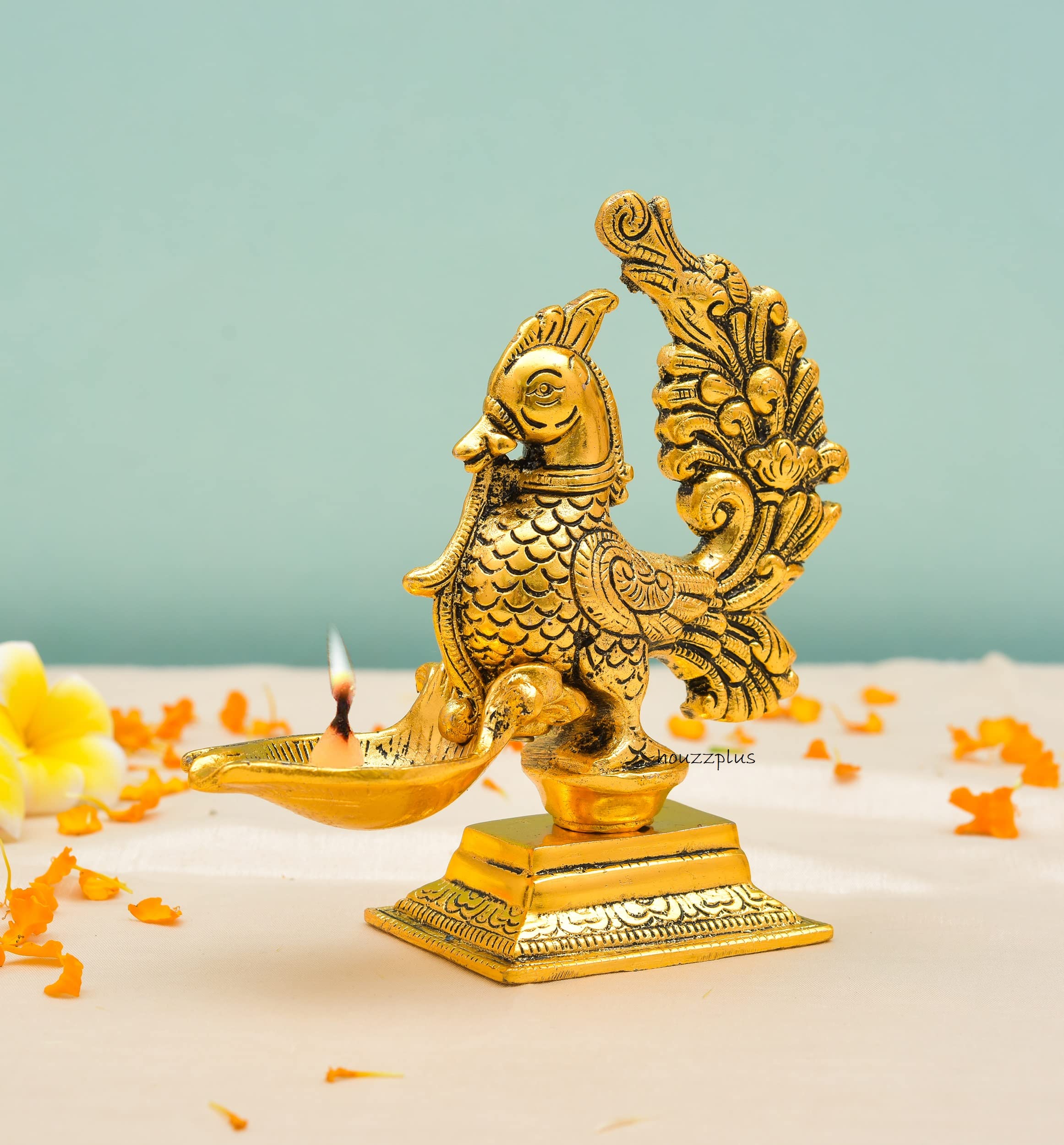 About Product- Peacock Design Metal Tabletop Oil Lamp Diya || Product dimensions 15 cm x 5 cm x 14 cm (LXWXH)|| material - metal (Aluminium)|| Color - Gold
