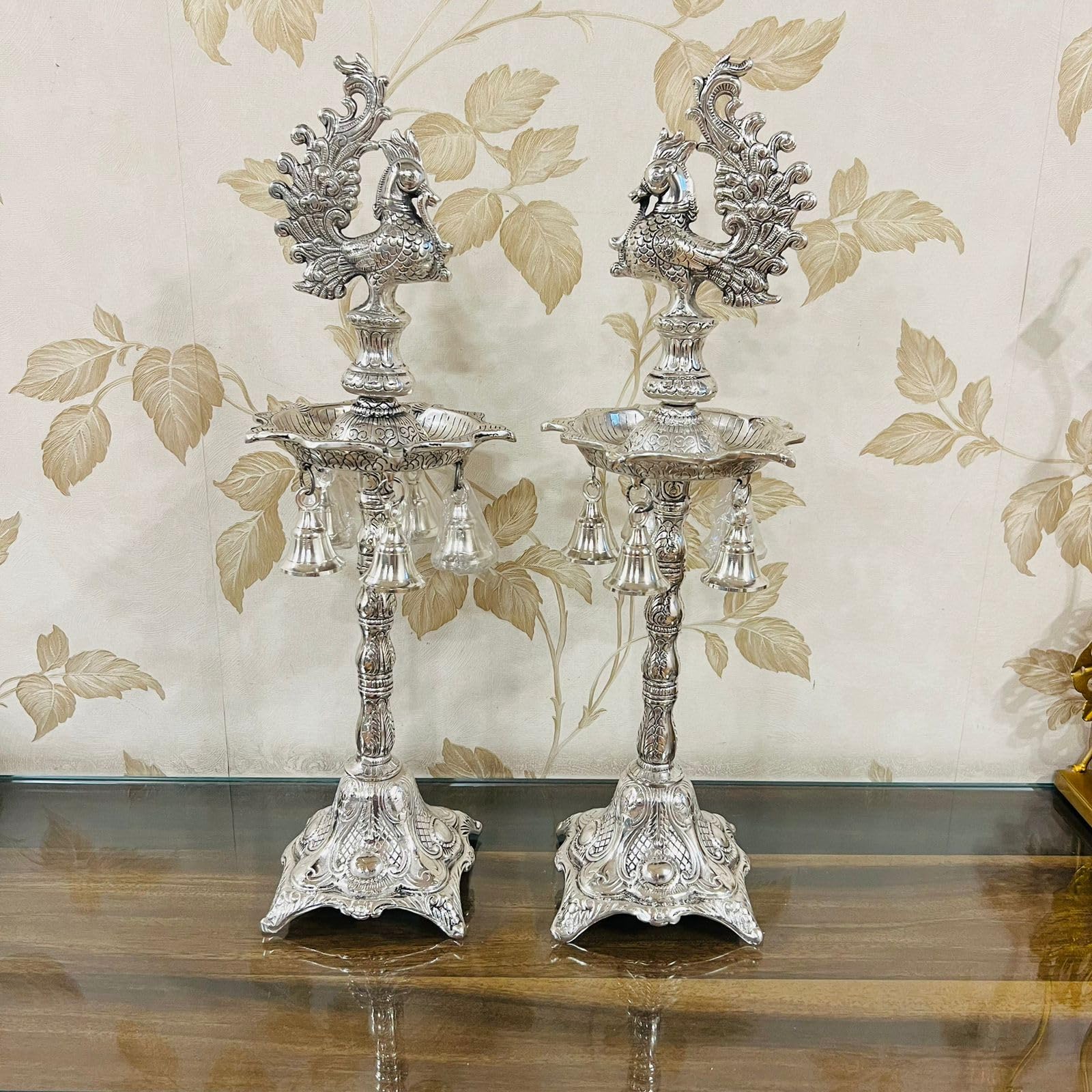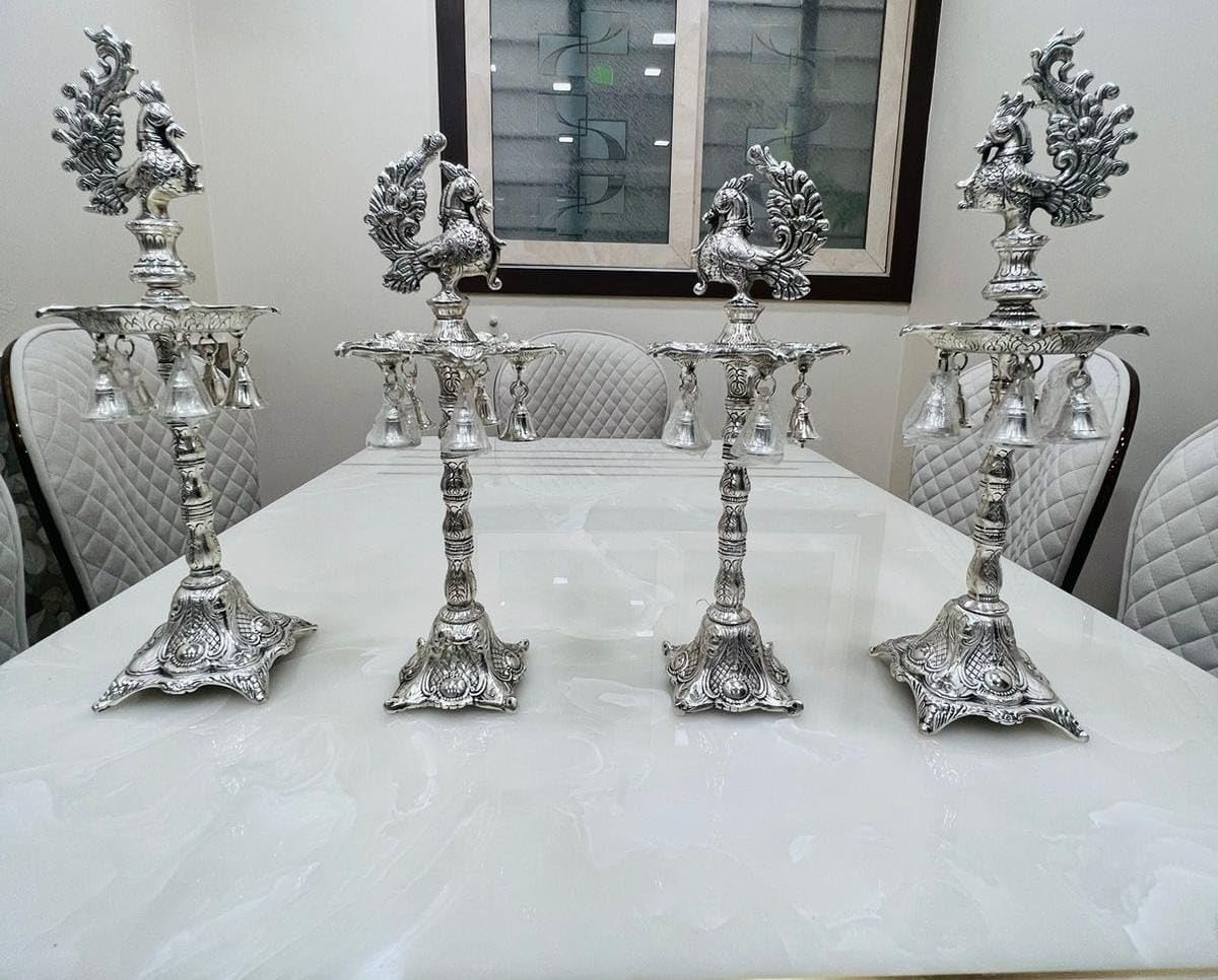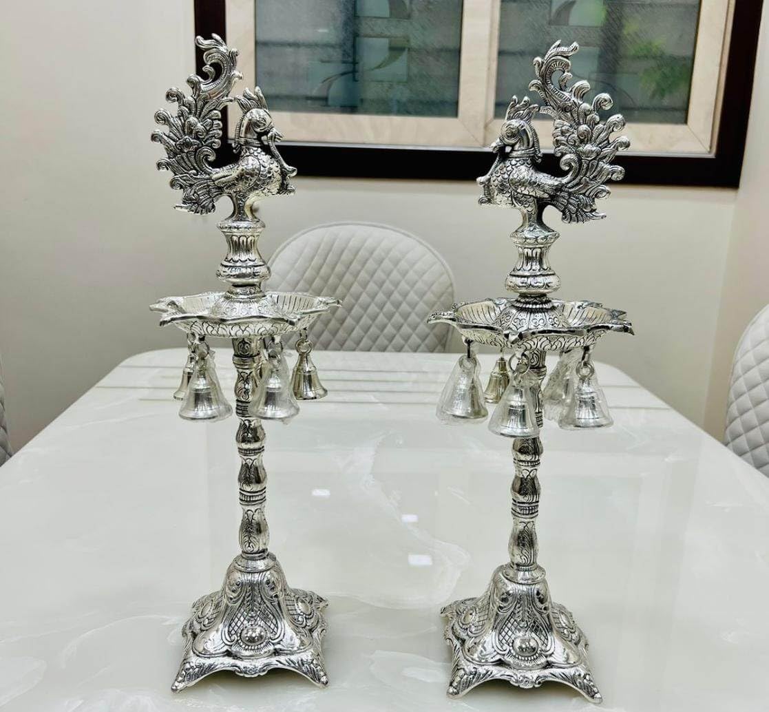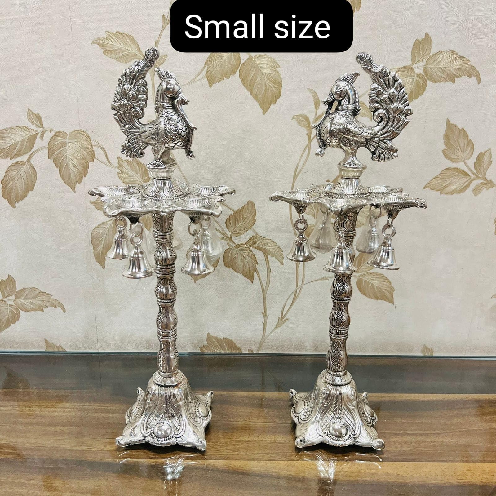 German Silver Brass Plated Peacock Samai Diya Diwali Gifts Metal Diya Handmade Indian Pooja Oil Lamp Silver Diya Lamp Akandh 5 Wick Diya Home Decor It is made from German Alloy Metal (Composition of Copper Zinc Nickel); which is finished with silver plating and "oxidized work" on its surface which gives it a "antique look". It has hand made work with beautifully hand crafting on German Alloy Metal. It is made by Metal carving work Rural India artisans who made it an accurate durable and washable product. Light up your home with this beautiful Ganesha Diya. Crafted from a quality German Silver Ganesha Figurine oil lamps add charm to the beauty. People light up these wick lamps for performing aarti of Gods they worship. These are also used as Diwali lights. Made in brass this is a solid piece of collectible figurine sculpture that you would be happy to keep at your home. Gift your loved ones this attractive Diya for special occasions. The premium bell has beautiful sound and is an essential for temple at home. This product is crafted from brass that is considered to be a sacred metal and traditionally used in prayer accessories. The sweet sound of this bell will fill the atmosphere with divine sound during any pooja / ceremony. German Silver Ganesha Samai Diya Diwali Gifts Metal Diya Handmade Indian Pooja Oil Lamp Silver Diya Lamp Akandh 5 Wick Diya Home Decor Illuminate your home with the enchanting beauty of our German Silver Hand-Engraved Peacock Samai/Diya with Bells. This exquisite piece combines traditional craftsmanship with elegant design creating a mesmerizing addition to your festive decorations or everyday ambiance. Crafted with meticulous attention to detail our samai/diya showcases the artistry of skilled artisans. Made from premium German silver it boasts a radiant shine and durability that will withstand the test of time. The intricate hand engravings on the surface depict a graceful peacock motif symbolizing beauty prosperity
