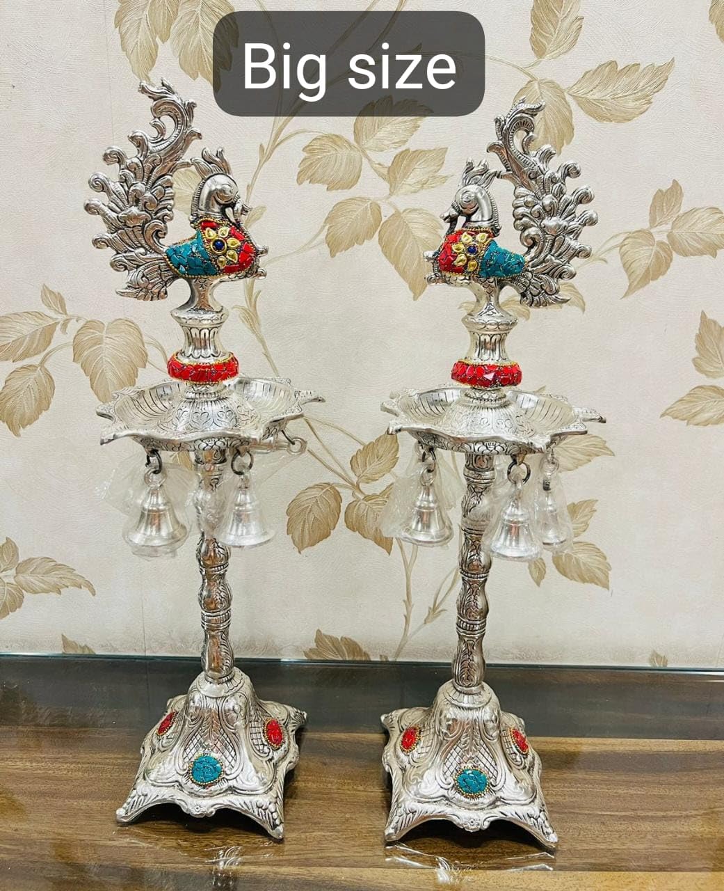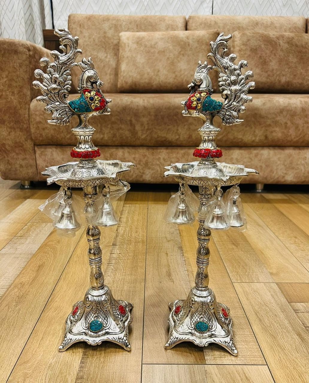 • Embrace the charm of traditional craftsmanship the allure of the peacock and the soothing glow of diyas with our German Silver Hand-Engraved Peacock Samai/Diya with Bells.