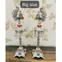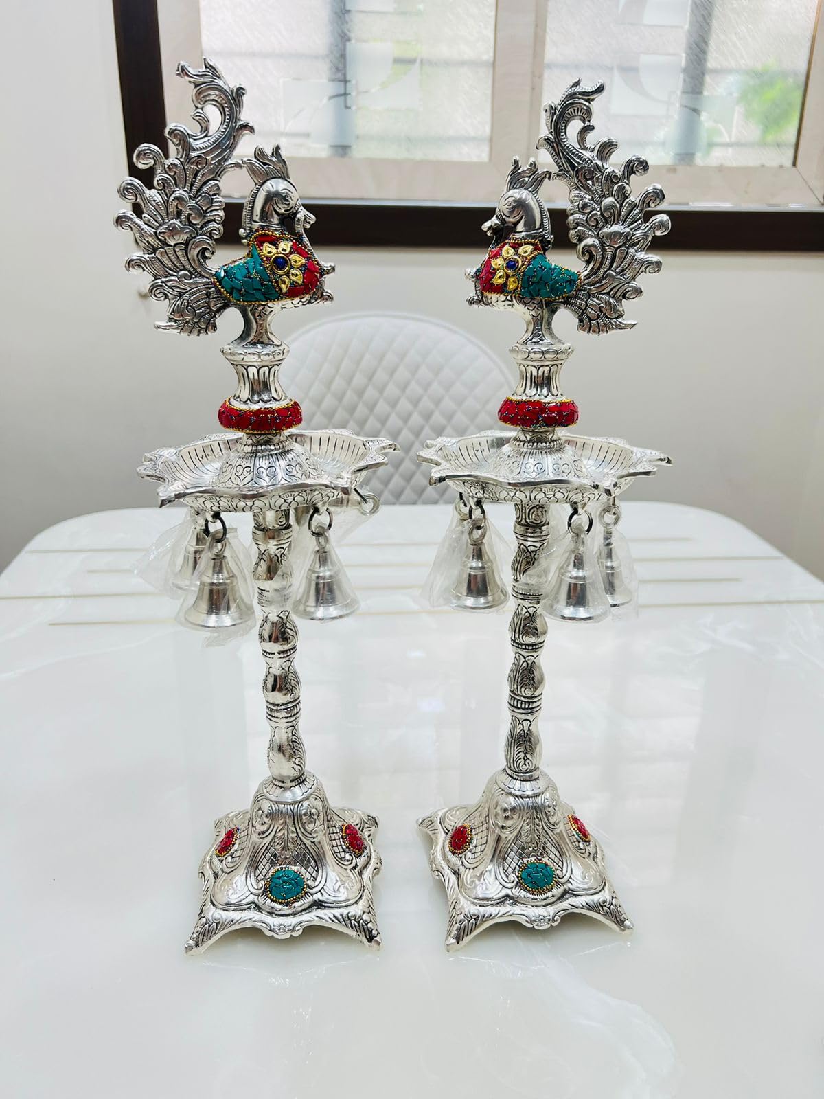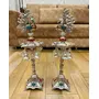 German Silver Hand Engraved Peacock Samai Pair / Diya Stand Pair with Semi Precious Stone Carving Work for Decoration & Gifts - Pack of 2 (Size - 21 x 7 Inch)