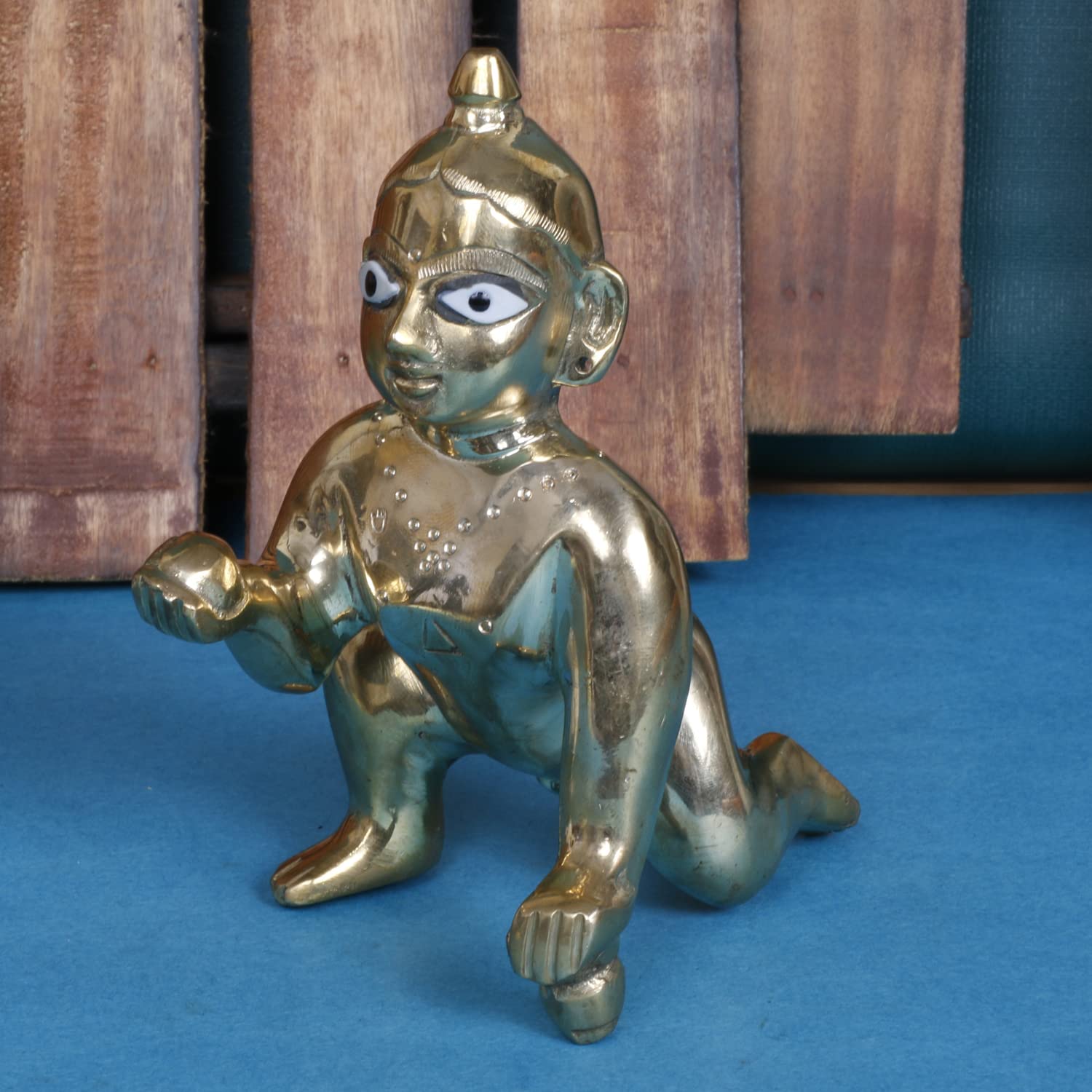 Thakurji Murti Idol Statue Sculpture / Laddu Gopal Idol (Brass)/Bal Gopal Murti / Metal Laddu Gopal Bal Gopal Kisshna statueThakur ji / Ladoo Gopal Ji | Baby Krishna| Kanhaiya by BigMart This brass idol of Lord Krishna is meant for performing puja at your home or for simply decorating your home in Hindu way. Artisans of Muradabad in north India have crafted this statue using age-old sand casting technique. In all of Hindu mythology this is probably the only relationship marked by romance playfulness as well as flirtatiousness. According to the Bhagavata Purana which is a sattvic puranaasserts that Krishna is "Bhagavan Himself" and subordinates to itself all other forms: Vishnu Narayana Purusha Ishvara Hari Vasudeva Janardana etc. Krishna is often described and portrayed as an infant or young boy playing a flute as in the Bhagavata Purana or as a youthful prince giving direction and guidance as in the Bhagavad Gita. The stories of Krishna appear across a broad spectrum of Hindu philosophical and theological traditions.They portray him in various perspectives: a God-child a prankster a model lover a divine hero and the supreme being.The principal scriptures discussing Krishna's story are the Mahabharata the Harivamsa the Bhagavata Purana and the Vishnu Purana. He is also called as Govinda & Gopala. This Beautiful statue of Baby Krishna by Kriwin is ideal for pooja room home decor or gifting.