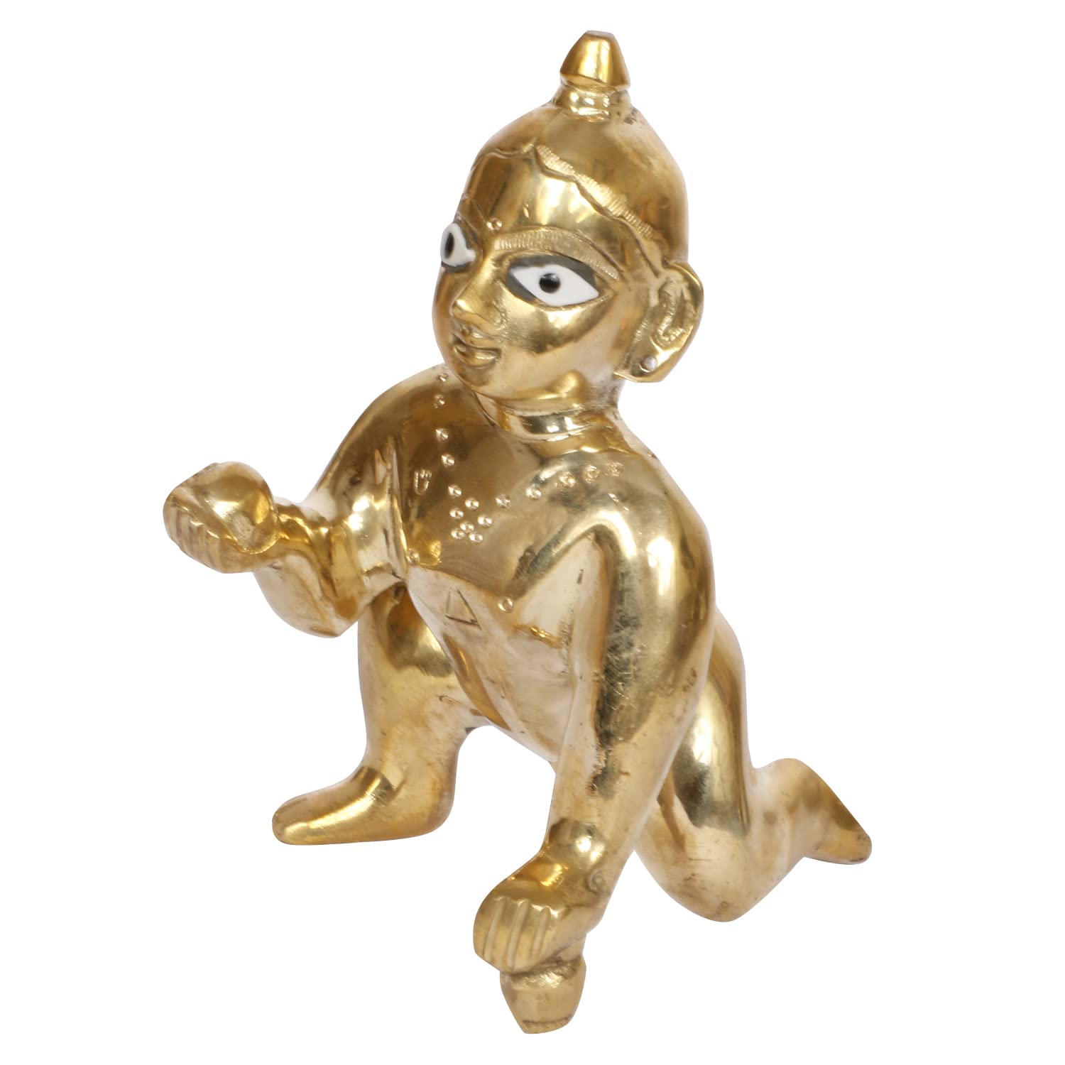 Thakurji Murti Idol Statue Sculpture / Laddu Gopal Idol (Brass)/Bal Gopal Murti / Metal Laddu Gopal Bal Gopal Kisshna statueThakur ji / Ladoo Gopal Ji | Baby Krishna| Kanhaiya by BigMart This brass idol of Lord Krishna is meant for performing puja at your home or for simply decorating your home in Hindu way. Artisans of Muradabad in north India have crafted this statue using age-old sand casting technique. In all of Hindu mythology this is probably the only relationship marked by romance playfulness as well as flirtatiousness. According to the Bhagavata Purana which is a sattvic puranaasserts that Krishna is "Bhagavan Himself" and subordinates to itself all other forms: Vishnu Narayana Purusha Ishvara Hari Vasudeva Janardana etc. Krishna is often described and portrayed as an infant or young boy playing a flute as in the Bhagavata Purana or as a youthful prince giving direction and guidance as in the Bhagavad Gita. The stories of Krishna appear across a broad spectrum of Hindu philosophical and theological traditions.They portray him in various perspectives: a God-child a prankster a model lover a divine hero and the supreme being.The principal scriptures discussing Krishna's story are the Mahabharata the Harivamsa the Bhagavata Purana and the Vishnu Purana. He is also called as Govinda & Gopala. This Beautiful statue of Baby Krishna by Kriwin is ideal for pooja room home decor or gifting.