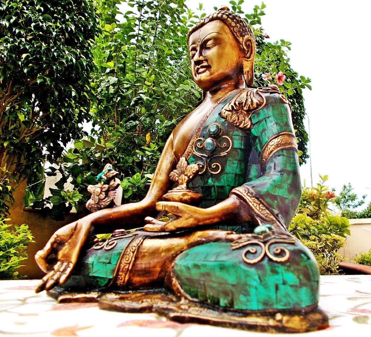 Magnicificant large Medicine Buddha statue. This large Tibetan brass (metal ) statue has very detailed hand work of & turquoise gemstones work around it. Medicine Buddha is known for healing inner and outer sickness. Buddha is symbol for peace luck and prosperity. Impress your friend with this unique and valuable collectible. This large buddha buddha will add a character to your home dcor restaurant or studio dcor. This Buddha statue would definitely a center attraction.