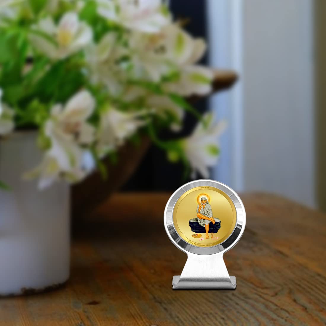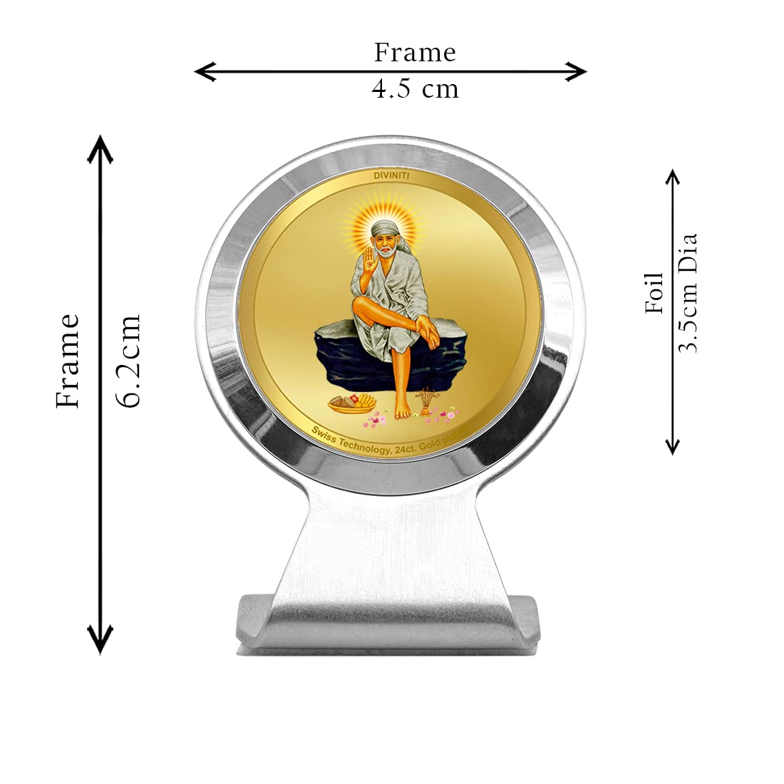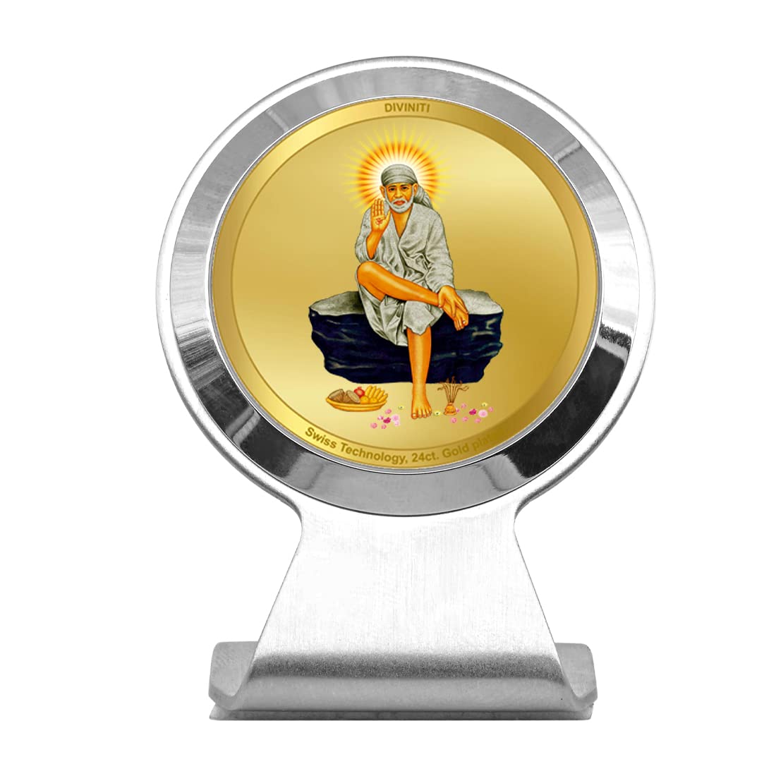 DIVINITI Sai Baba Photo Frame for Car Dashboard Car Idol Table Decor|MCF 1CR Metallic Car Frame with 24K Gold Plated Foil|Religious Frame For Pooja Prayer and Gift (6.2X4.5CM)